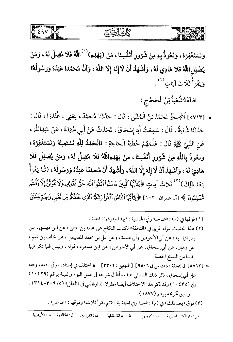 5713- أَخبَرنا مُحَمدُ بنُ المُثَنَّى، قَالَ: حَدَّثنا مُحَمدٌ، يَعْنِي غُنْدَرًا، قَالَ حَدَّثنا شُعْبَةُ، قَالَ: سَمِعْتُ أَبَا إِسحَاقَ يُحَدِّثُ عَن أَبي عُبَيْدَةَ، عَن عَبدِ اللهِ، عَنِ النَّبيِّ صَلى الله عَلَيهِ وسَلم، قَالَ: عَلَّمَهُمْ خُطْبَةَ الحَاجَةِ: الحَمْدُ للهِ نَسْتَعِينُهُ، وَنَسْتَغْفِرُهُ، وَنَعُوذُ بِاللهِ مِنْ شُرُورِ أَنْفُسِنَا، مَنْ يَهْدِهِ اللهُ فَلا مُضِلَّ لَهُ، وَمَنْ يُضْلِلْ فَلا هَادِيَ لَهُ، وَأَشْهَدُ أَنَّ لا إِلَهَ إِلاَّ اللهُ، وَأَشْهَدُ أَنَّ مُحَمدًا عَبدُهُ وَرَسُولُهُ، ثُمَّ يَقْرَأُ بَعْدَ ذَلِكَ ثَلاثَ آيَاتٍ: {يَا أَيُّهَا الَّذِينَ آمَنُوا اتَّقُوا اللهَ حَقَّ تُقَاتِهِ وَلا تَمُوتُنَّ إِلاَّ وَأَنْتُمْ مُسْلِمُونَ}، {يَا أَيُّهَا النَّاسُ اتَّقُوا رَبَّكُمُ الَّذِي خَلْقَكُمْ مِنْ نَفْسٍ وَاحِدَةٍ وَخَلَقَ مِنْهَا زَوْجَهَا وَبَثَّ مِنْهُمَا رِجَالاً كَثِيرًا وَنِسَاءً}، {يَا أَيُّهَا الَّذِينَ آمَنُوا اتَّقُوا اللهَ وَقُولُوا قَوْلاً سَدِيدًا}، ثُمَّ يَذْكُرُ حَاجَتَهُ.