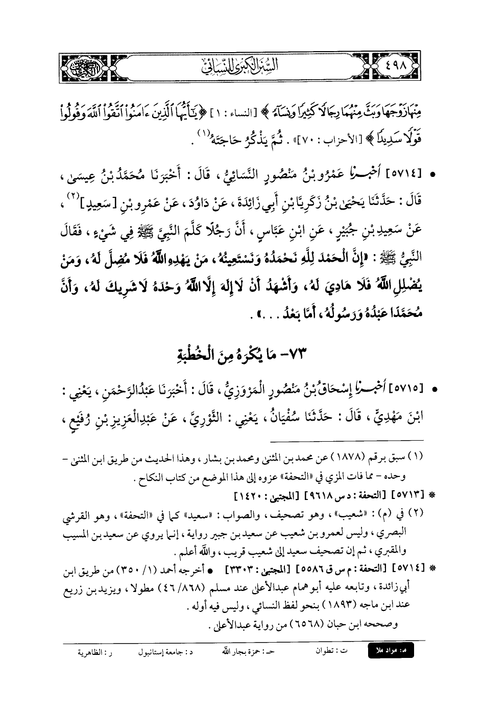 5714- أَخبَرنا عَمْرُو بنُ مَنْصُورٍ النَّسَائِيُّ، قَالَ: أَخبَرنا مُحَمدُ بنُ عِيسَى، قَالَ: حَدَّثنا يَحْيَى بنُ زَكَرِيَّا بنِ أَبي زَائِدَةَ، عَن دَاوُدَ، عَن عَمْرِو بنِ سَعِيدٍ، عَن سَعِيدِ بنِ جُبَيْرٍ، عَنِ ابْنِ عَبَّاسٍ، أَنَّ رَجُلاً كَلَّمَ النَّبيَّ صَلى الله عَلَيهِ وسَلم فِي شَيْءٍ، فَقَالَ النَّبيُّ صَلى الله عَلَيهِ وسَلم: إِنَّ الحَمْدَ للهِ نَحْمَدُهُ وَنَسْتَعِينُهُ، مَنْ يَهْدِهِ اللهُ فَلا مُضِلَّ لَهُ، وَمَنْ يُضْلِلِ فَلا هَادِيَ لَهُ، وَأَشْهَدُ أَنَّ لا إِلَهَ إِلاَّ اللهُ، وَحْدَهُ لا شَرِيكَ لَهُ، وَأَنَّ مُحَمدًا عَبدُهُ وَرَسُولُهُ، أَمَّا بَعْدُ ....