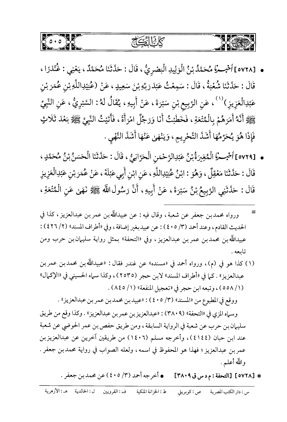 5728- أَخْبَرَنِي مُحَمدُ بنُ الوَلِيدِ البَصْرِيُّ، قَالَ: حَدَّثنا مُحَمدٌ، يَعْنِي غُنْدَرًا، قَالَ: حَدَّثنا شُعْبَةُ، قَالَ: سَمِعْتُ عَبدَ رَبِّهِ بنِ سَعِيدٍ، عَن عَبدِ العَزِيزِ بنِ عُمَرَ بنِ عَبدِ العَزِيزِ (1)، عَنِ الرَّبِيعِ بنِ سَبْرَةَ، عَن أَبيهِ، يُقَالُ لَهُ: السَّبْرِيُّ، عَنِ النَّبيِّ صَلى الله عَلَيهِ وسَلم، أَنَّهُ أَمْرَهُمْ بِالمُتْعَةِ، فَخَطَبْتُ أَنَا وَرَجُلٌ امْرَأَةً، فَأَتَيْتُ النَّبيَّ صَلى الله عَلَيهِ وسَلم بَعْدَ ثَلاثٍ، فَإِذَا هُوَ يُحَرِّمُهَا أَشَدَّ التَّحْرِيمِ، وَيَنْهَى عَنهَا أَشَدَّ النَّهْيِ.