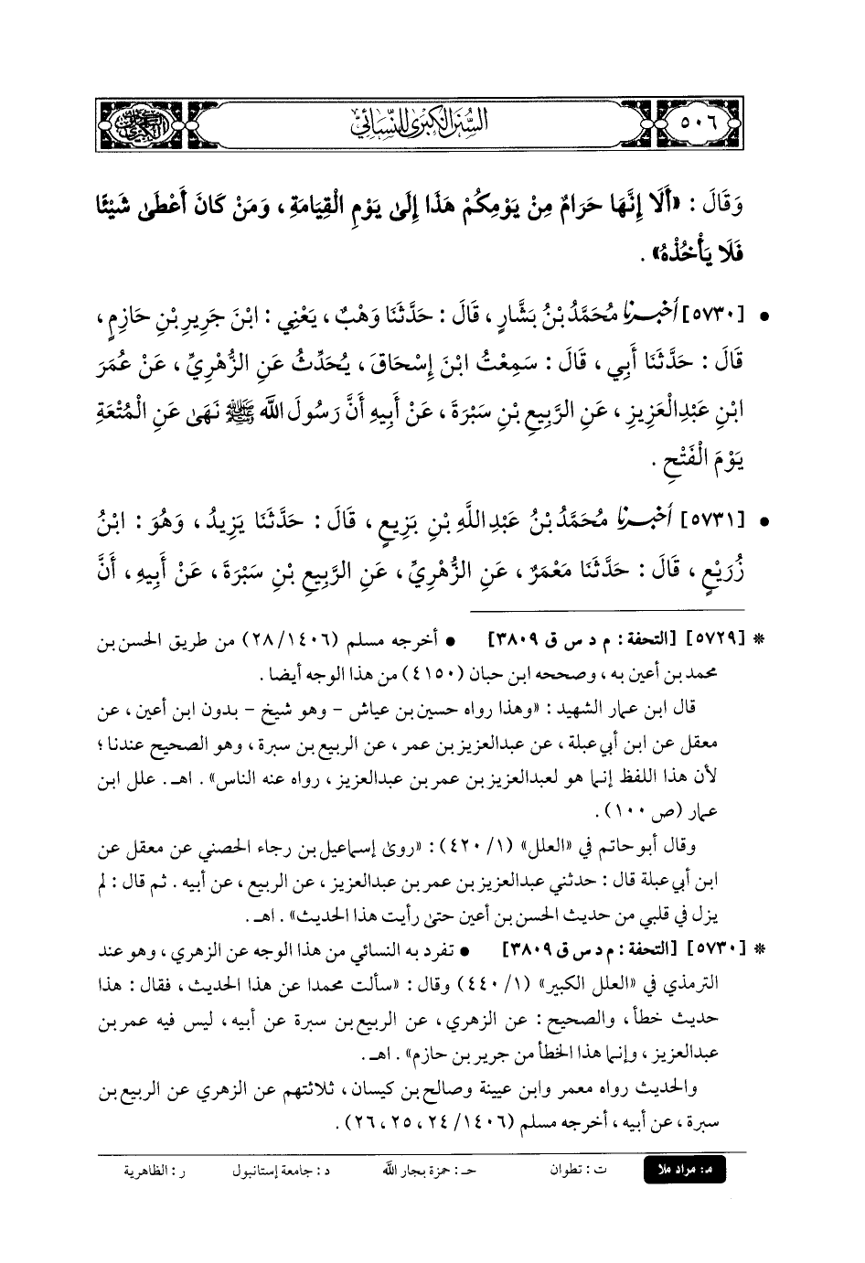 5730- أَخبَرنا مُحَمدُ بنُ بَشَّارٍ، قَالَ: حَدَّثنا وَهْبٌ، يَعْنِي ابْنَ جَرِيرِ بنِ حَازِمٍ، قَالَ: حَدَّثنا أَبي، قَالَ: سَمِعْتُ ابْنَ إِسحَاقَ يُحَدِّثُ عَنِ الزُّهْرِيِّ، عَن عُمَرَ بنِ عَبدِ العَزِيزِ، عَنِ الرَّبِيعِ بنِ سَبْرَةَ، عَن أَبيهِ، أَنَّ رَسُولَ اللهِ صَلى الله عَلَيهِ وسَلم نَهَى عَنِ المُتْعَةِ يَوْمَ الفَتْحِ.