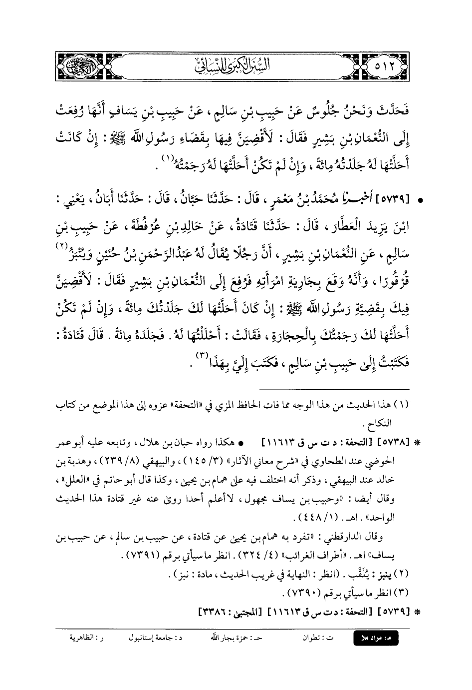 5739- أَخبَرنا مُحَمدُ بنُ مَعْمَرٍ، قَالَ: حَدَّثنا حَبَّانُ، قَالَ: حَدَّثنا أَبَانُ، يَعْنِي ابْنَ يَزِيدَ العَطَّارَ، قَالَ: حَدَّثنا قَتَادَةُ، عَن خَالِدِ بنِ عُرْفُطَةَ، عَن حَبِيبِ بنِ سَالِمٍ، عَنِ النُّعْمَانِ بنِ بَشِيرٍ، أَنَّ رَجُلاً يُقَالُ لَهُ: عَبدُ الرَّحمَنِ بنُ حُنَيْنٍ، وَيُنْبَزُ قُرْقُورًا وأَنَّهُ وَقَعَ بِجَارِيَةِ امْرَأَتِهِ، فَرُفِعَ إِلَى النُّعْمَانِ بنِ بَشِيرٍ، فَقَالَ: لأَقْضِيَنَّ فِيكَ بِقَضِيَّةِ رَسُولِ اللهِ صَلى الله عَلَيهِ وسَلم، إِنْ كَانَ أَحَلَّتْهَا لَكَ جَلَدْتُكَ مِئَةً، وَإِنْ لَمْ تَكُنْ أَحَلَّتْهَا لَكَ رَجَمْتُكَ بِالحِجَارَةِ، فَقَالَتْ: أَحْلَلْتُهَا لَهُ، فَجَلَدَهُ مِئَةً.