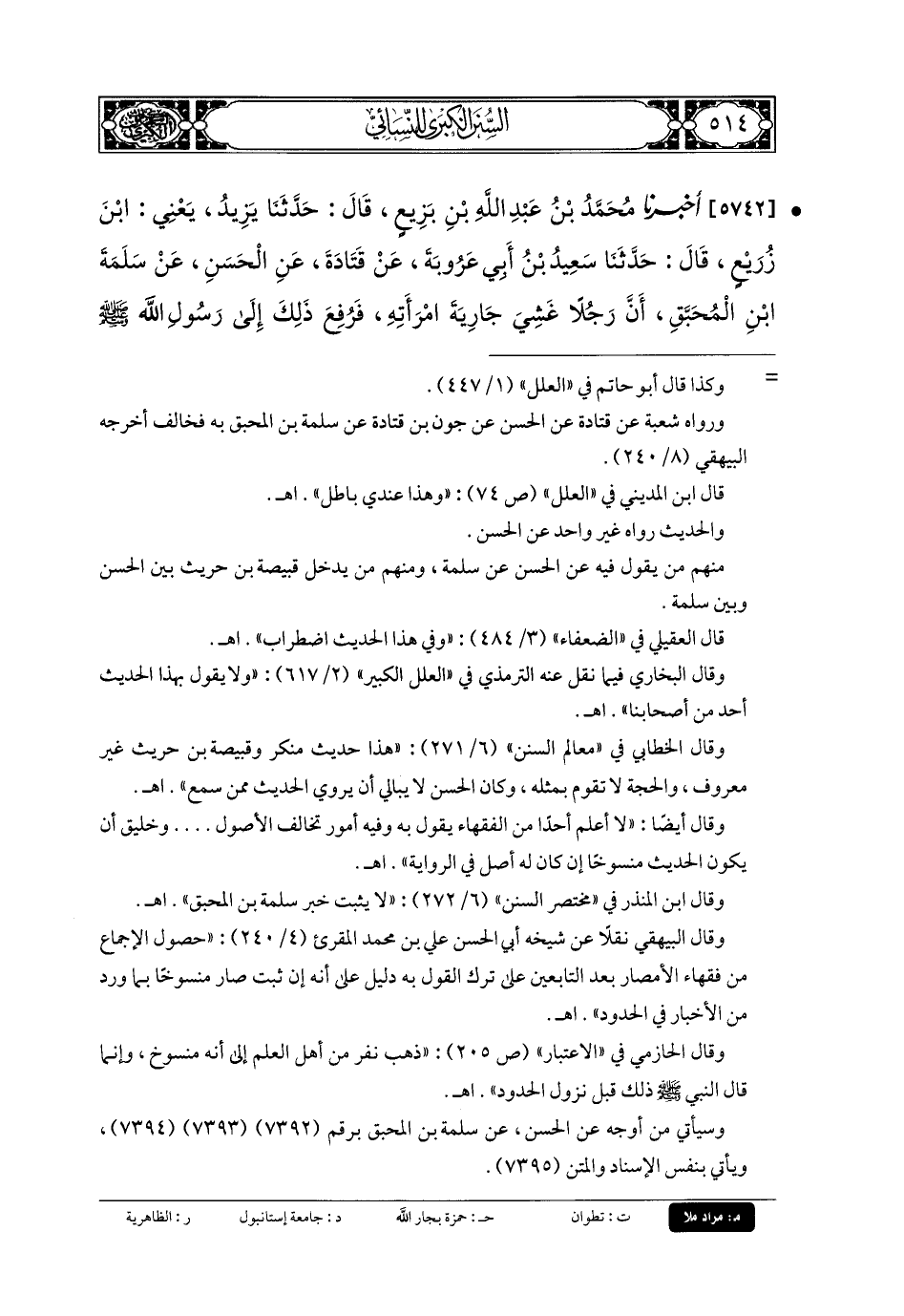 5742- أَخبَرنا مُحَمدُ بنُ عَبدِ اللهِ بنِ بَزِيعٍ، قَالَ: حَدَّثنا يَزِيدُ، يَعْنِي ابْنَ زُرَيْعٍ، قَالَ: حَدَّثنا سَعِيدُ بنُ أَبي عَرُوبَةَ، عَن قَتَادَةَ، عَنِ الحَسَنِ، عَن سَلَمَةَ بنِ المُحَبَّقِ، أَنَّ رَجُلاً غَشِيَ جَارِيَةَ امْرَأَتِهِ، فَرُفِعَ ذَلِكَ إِلَى رَسُولِ اللهِ صَلى الله عَلَيهِ وسَلم، فَقَالَ: إِنْ كَانَ اسْتَكْرَهَهَا، فَهِيَ حُرَّةٌ مِنْ مَالِهِ، وَعَلَيْهِ الشَّرْوَى، وَإِنْ كَانَتْ طَاوَعَتْهُ فَهِيَ لِسَيِّدَتِهَا، وَمِثْلُهَا مِنْ مَالِهِ.