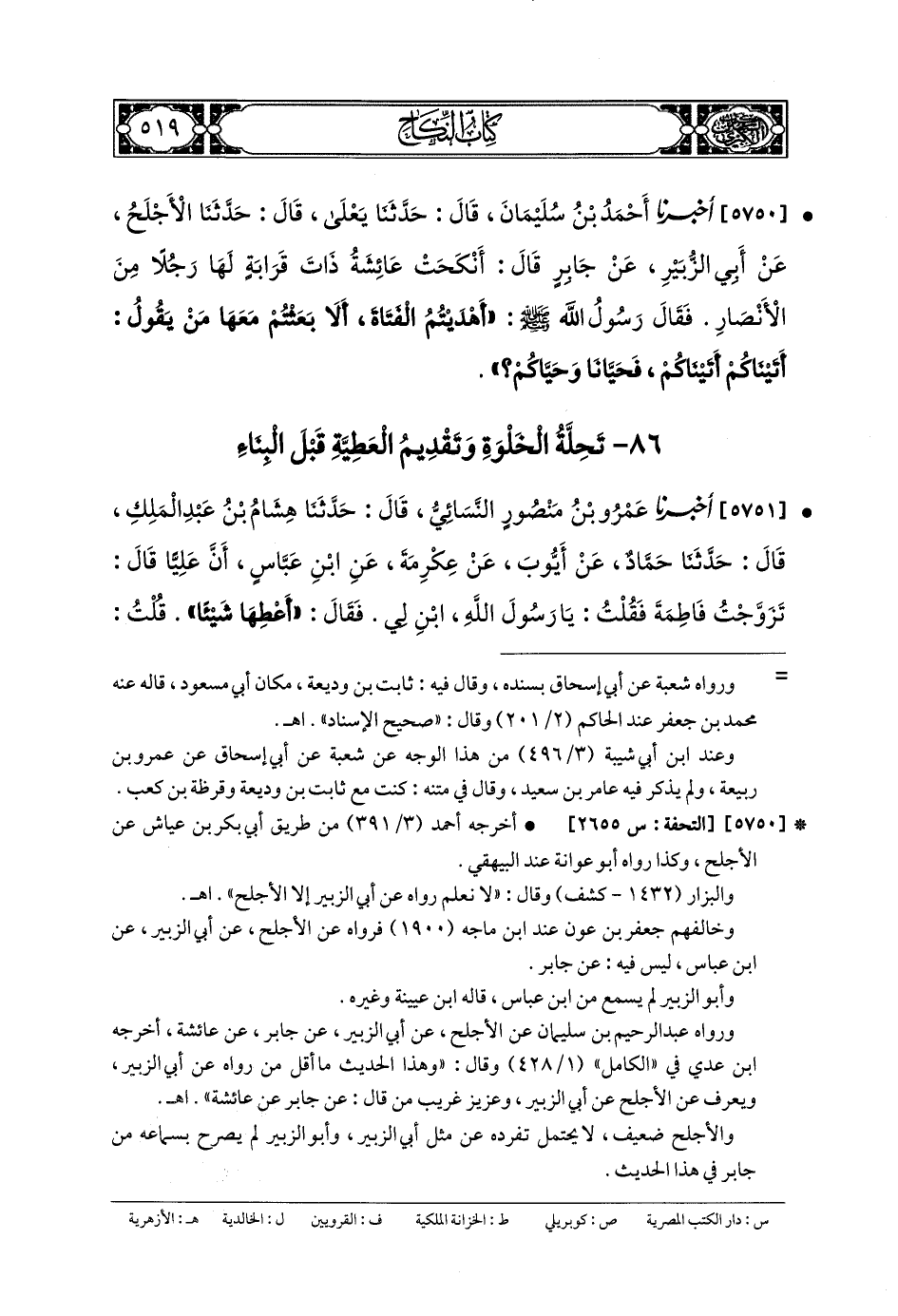 5750- أَخبَرنا أَحْمَدُ بنُ سُلَيْمَانَ، قَالَ: حَدَّثنا يَعْلَى، قَالَ: حَدَّثنا الأَجْلَحُ، عَن أَبي الزُّبَيْرِ، عَن جَابِرٍ، قَالَ: أَنْكَحَتْ عَائِشَةُ ذَاتَ قَرَابَةٍ لَهَا رَجُلاً مِنَ الأَنْصَارِ، فَقَالَ رَسُولُ اللهِ صَلى الله عَلَيهِ وسَلم: أَهْدَيْتُمُ الفَتَاةَ أَلا بَعَثْتُمْ مَعَهَا مَنْ يَقُولُ: