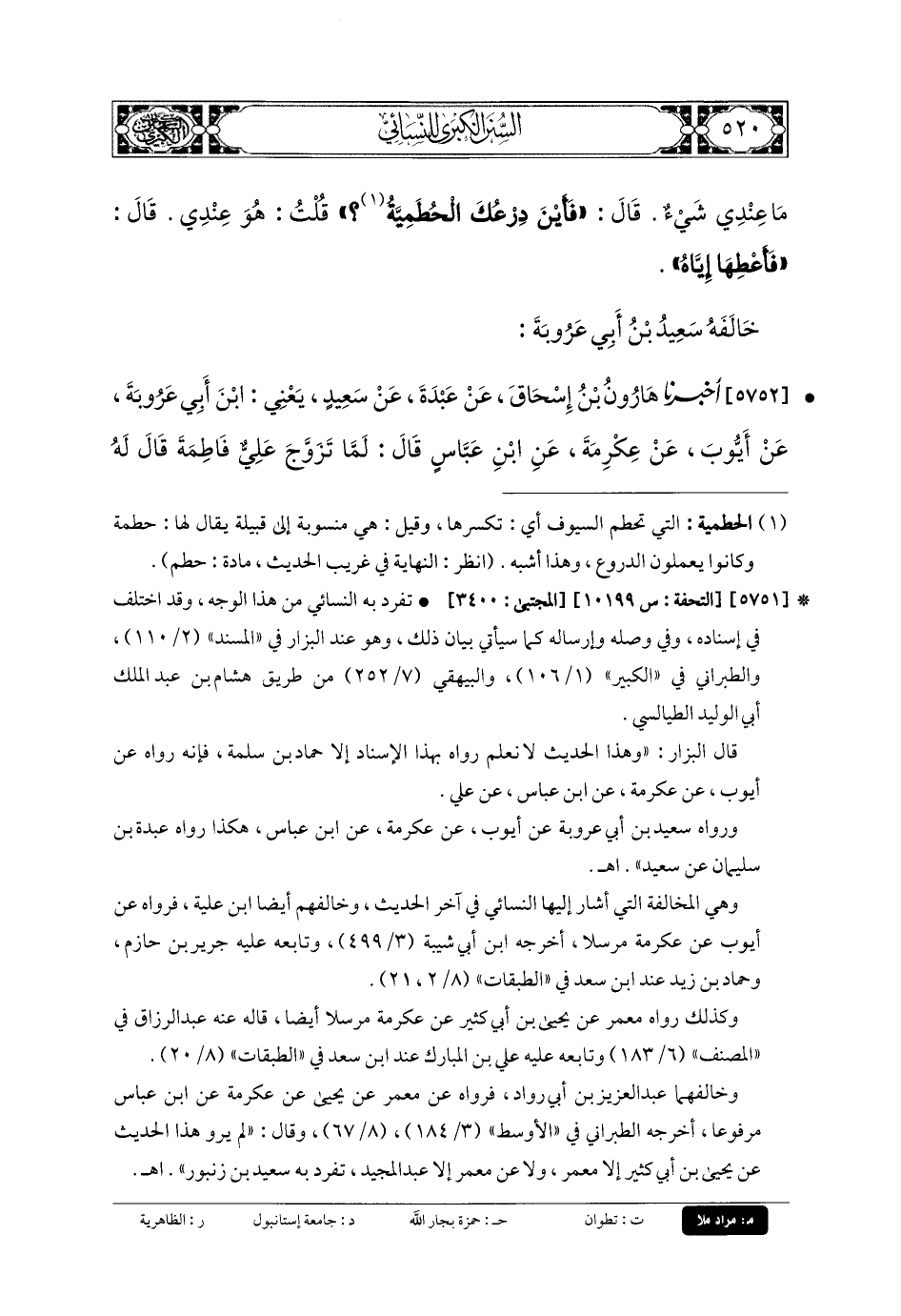 5752- أَخبَرنا هَارُونُ بنُ إِسحَاقَ، عَن عَبدَةَ، عَن سَعِيدٍ، يَعْنِي ابْنَ أَبي عَرُوبَةَ، عَن أَيوبَ، عَن عِكْرِمَةَ، عَنِ ابْنِ عَبَّاسٍ، قَالَ: لَمَّا تَزَوَّجَ عَليٌّ فَاطِمَةَ، قَالَ لَهُ رَسُولُ اللهِ صَلى الله عَلَيهِ وسَلم: أَعْطِيهَا شَيْئًا، قَالَ: مَا عِنْدِي شَيْءٌ، قَالَ: فَأَيْنَ دِرْعُكَ الحُطَمِيَّةُ؟.