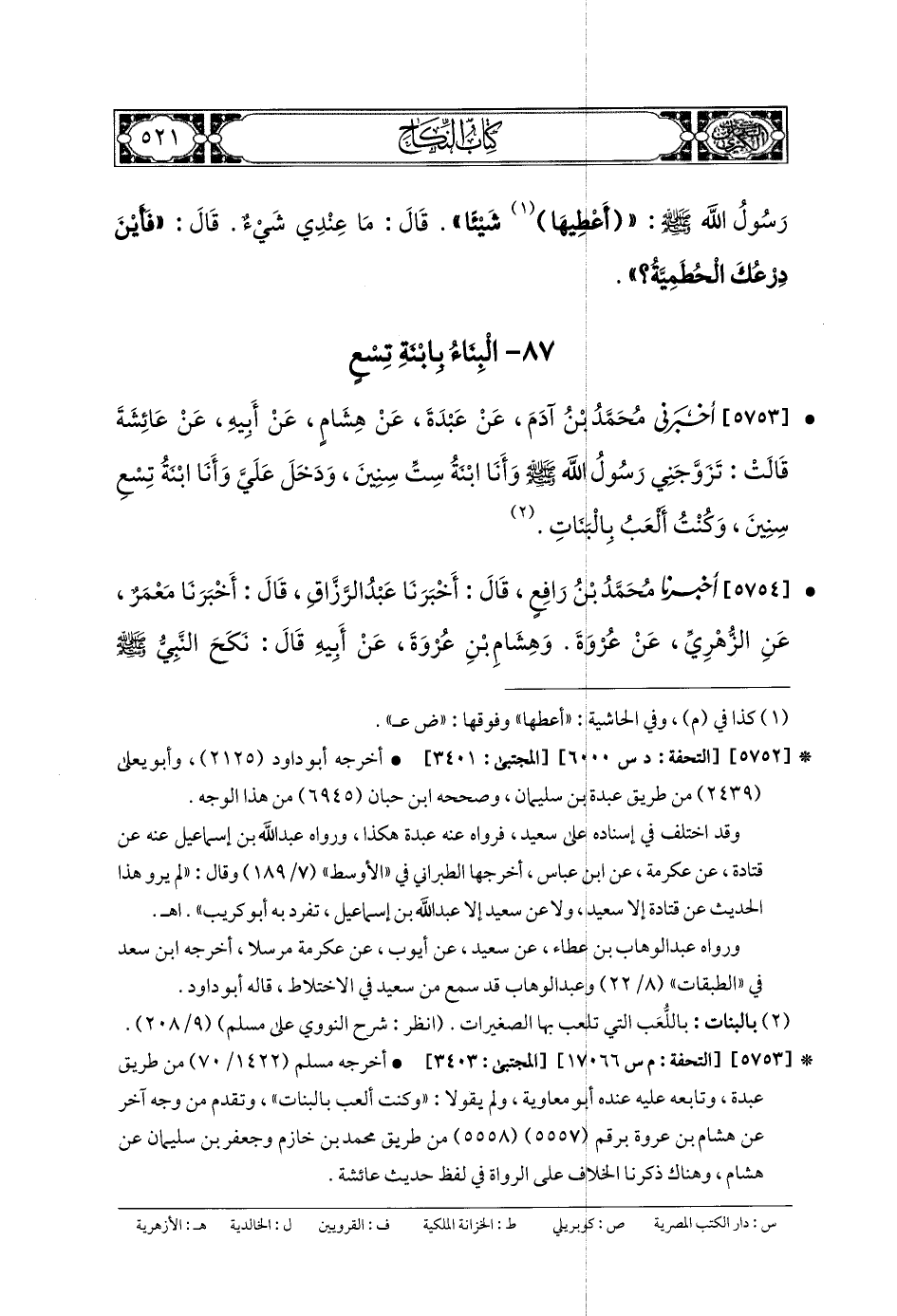 5753- أَخبَرني مُحَمدُ بنُ آدَمَ، عَن عَبدَةَ، عَن هِشَامٍ، عَن أَبيهِ، عَن عَائِشَةَ، قَالَتْ: تَزَوَّجَنِي رَسُولُ اللهِ صَلى الله عَلَيهِ وسَلم وَأَنَا ابْنَةُ سِتِّ سِنِينَ، وَدَخَلَ عَلَيَّ وَأَنَا ابْنَةُ تِسْعِ سِنِينَ، وَكُنْتُ أَلْعَبُ بِالبَنَاتِ.