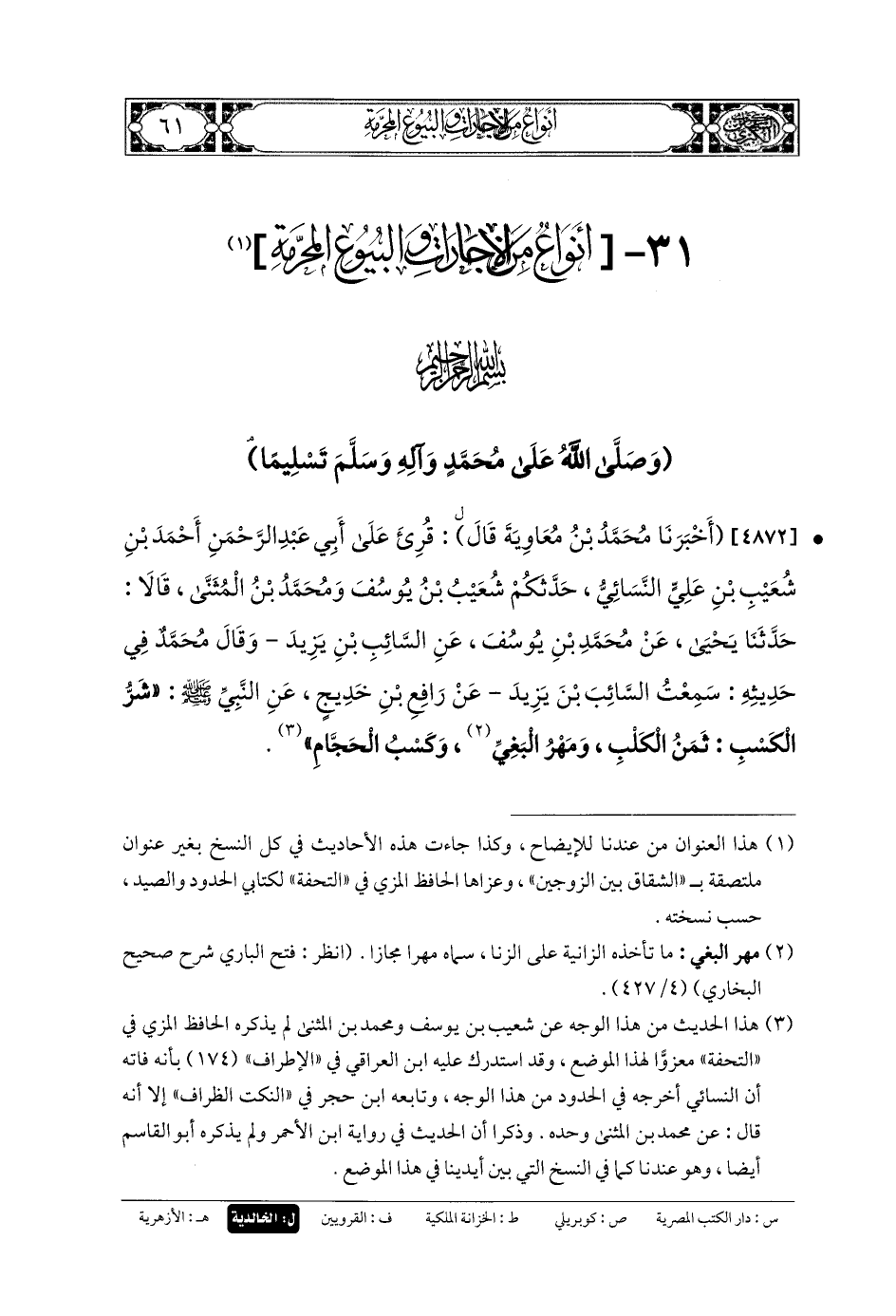 4872 - أَخبَرنا مُحَمَّدُ بْنُ مُعَاوِيَةَ، قَالَ: قُرِئَ عَلَى أَبي عَبدِ الرَّحمَنِ أَحْمَدَ بنِ شُعَيْبِ بنِ عَليٍّ النَّسَائِيِّ، حَدَّثَكُمْ شُعَيْبُ بنُ يُوسُفَ، وَمُحَمدُ بنُ المُثَنَّى، قَالا: حَدَّثنا يَحْيَى، عَن مُحَمدِ بنِ يُوسُفَ، عَنِ السَّائِبِ بنِ يَزِيدَ، وَقَالَ مُحَمدٌ فِي حَدِيثِهِ: سَمِعْتُ السَّائِبَ بْنَ يَزِيدَ، عَن رَافِعِ بنِ خَدِيجٍ، عَنِ النَّبيِّ صَلى الله عَلَيهِ وسَلم: شَرُّ الكَسْبِ ثَمَنُ الكَلْبِ، وَمَهْرُ البَغِيِّ، وَكَسْبُ الحَجَّامِ.