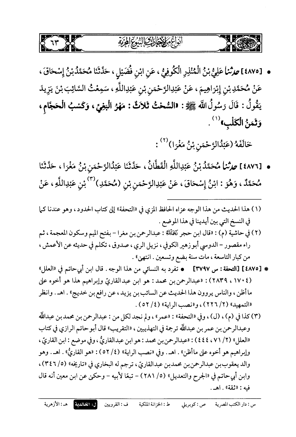 4875- حَدَّثنا عَليُّ بنُ المُنْذِرِ الكُوفِيُّ، عَنِ ابْنِ فُضَيْلٍ، حَدَّثنا مُحَمدُ بنُ إِسحَاقَ، عَن مُحَمدِ بنِ إِبْرَاهِيمَ، عَن عَبدِ الرَّحمَنِ بنِ عَبدِ اللهِ، سَمِعْتُ السَّائِبَ بْنَ يَزِيدَ يَقُولُ: قَالَ رَسُولُ اللهِ صَلى الله عَلَيهِ وسَلم: السُّحْتُ ثَلاثٌ: مَهْرُ البَغِيِّ، وَكَسْبُ الحَجَّامِ، وَثَمَنُ الكَلْبِ.