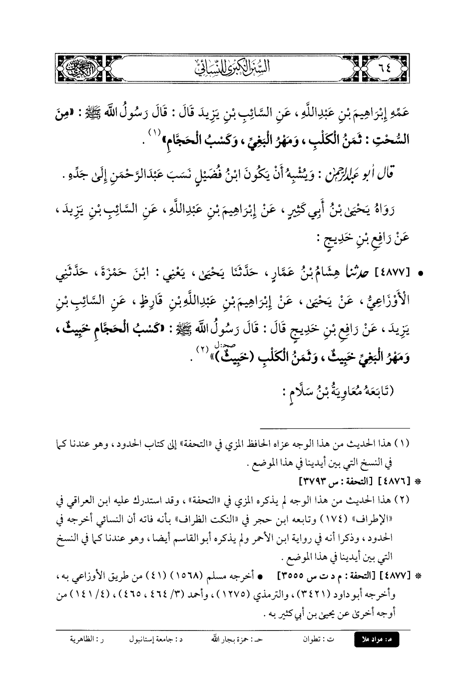 4877- حَدَّثنا هِشَامُ بنُ عَمَّارٍ، حَدَّثنا يَحْيَى، يَعْنِي ابْنَ حَمْزَةَ، حَدَّثني الأَوْزَاعِيُّ، عَن يَحْيَى، عَن إِبْرَاهِيمَ بنِ عَبدِ اللهِ بنِ قَارِظٍ، عَنِ السَّائِبِ بنِ يَزِيدَ، عَن رَافِعِ بنِ خَدِيجٍ قَالَ: قَالَ رَسُولُ اللهِ صَلى الله عَلَيهِ وسَلم: كَسْبُ الحَجَّامِ خَبِيثٌ، وَمَهْرُ البَغِيِّ خَبِيثٌ، وَثَمَنُ الكَلْبِ خَبِيثٌ.