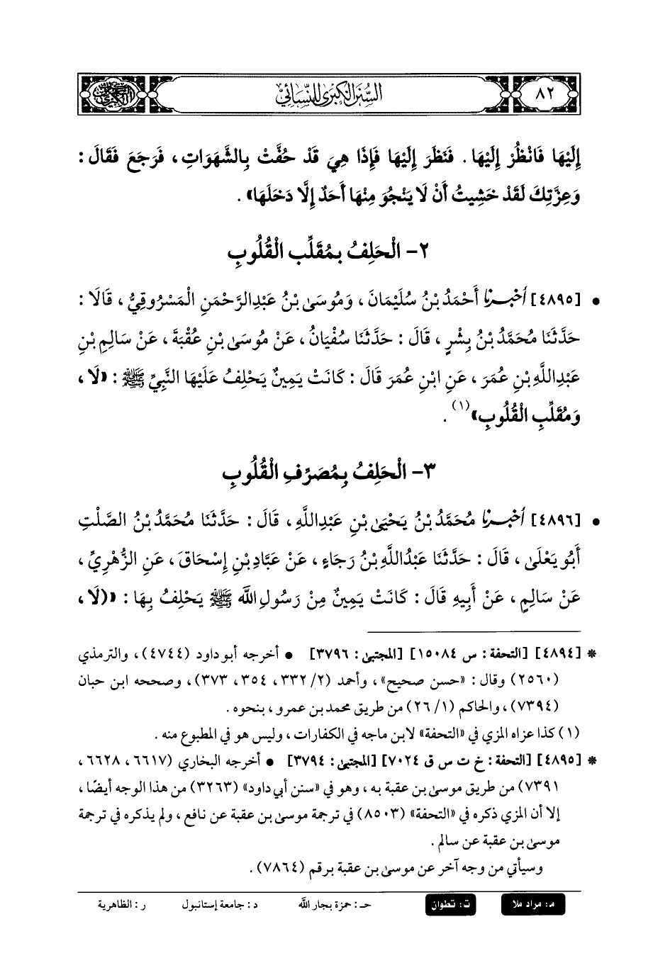 4895 - أَخبَرنا أَحْمَدُ بنُ سُلَيْمَانَ، وَمُوسَى بنُ عَبدِ الرَّحمَنِ المَسْرُوقِيُّ، قَالا: حَدَّثنا مُحَمدُ بنُ بِشْرٍ، قَالَ: حَدَّثنا سُفيانُ، عَن مُوسَى بنِ عُقْبَةَ، عَن سَالِمِ بنِ عَبدِ اللهِ بنِ عُمَرَ، عَنِ ابْنِ عُمَرَ قَالَ: كَانَتْ يَمِينٌ يَحْلِفُ عَلَيْهَا النَّبيُّ صَلى الله عَلَيهِ وسَلم لا، وَمُقَلِّبِ القُلُوبِ.
