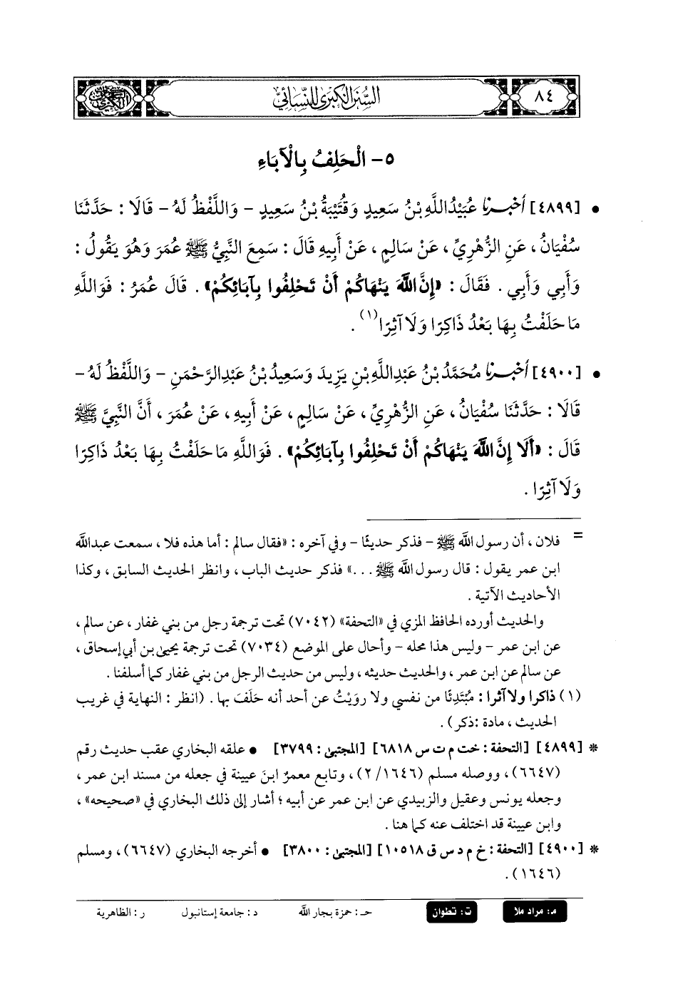 4900- أَخبَرنا مُحَمدُ بنُ عَبدِ اللهِ بنِ يَزِيدَ، وَسَعِيدُ بنُ عَبدِ الرَّحمَنِ، وَاللَّفْظُ لَهُ، قَالا: حَدَّثنا سُفيانُ، عَنِ الزُّهْرِيِّ، عَن سَالِمٍ، عَن أَبيهِ، عَن عُمَرَ، أَنَّ النَّبيَّ صَلى الله عَلَيهِ وسَلم قَالَ: أَلا إِنَّ اللهَ يَنْهَاكُمْ أَنْ تَحْلِفُوا بِآبَائِكُمْ، فَوَاللَّهِ مَا حَلَفْتُ بِهَا بَعْدُ ذَاكِرًا وَلا آثِرًا.