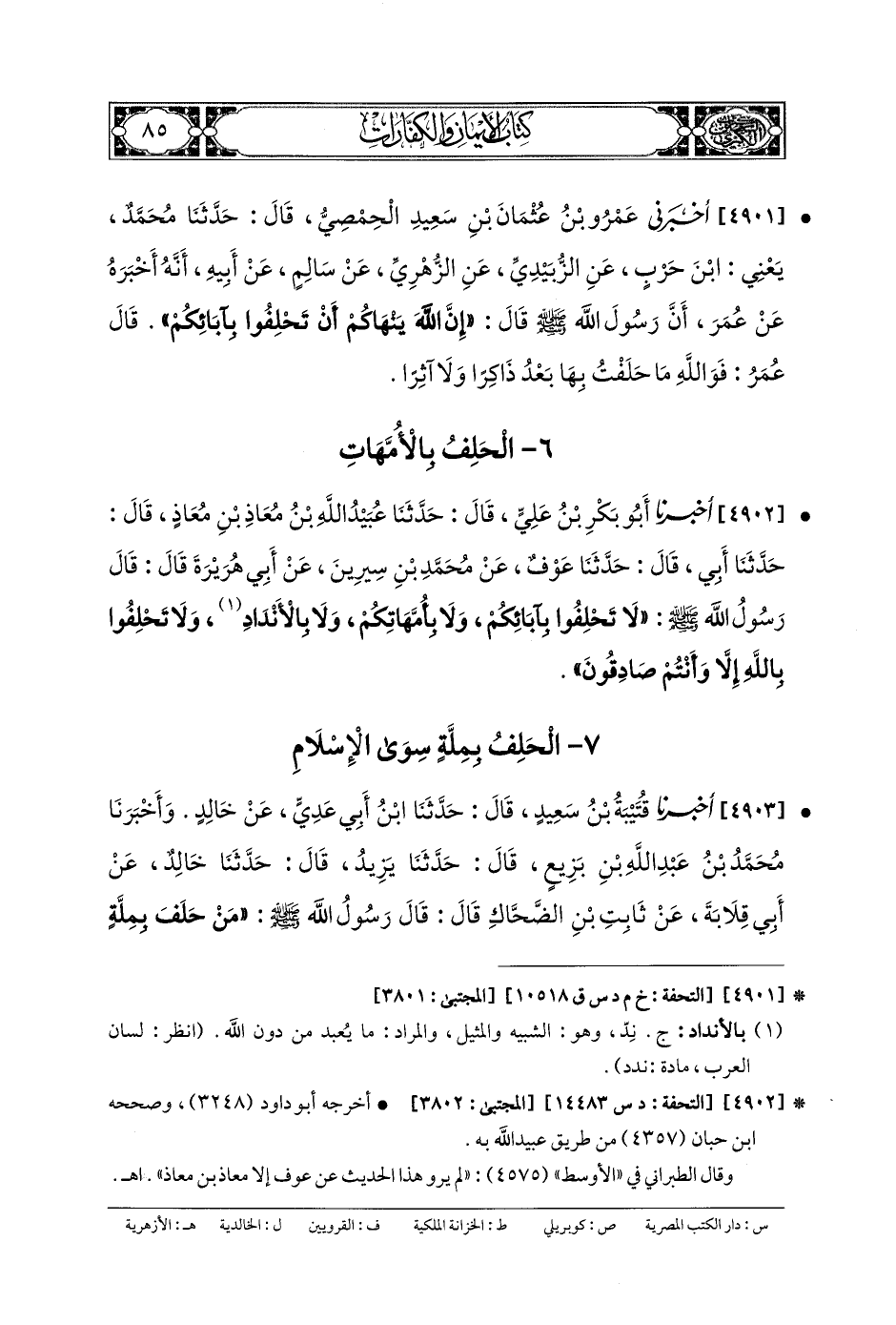4902- أَخبَرنا أَبو بَكْرِ بنُ عَليٍّ، قَالَ: حَدَّثنا عُبَيْدُ اللهِ بنُ مُعَاذِ بنِ مُعَاذٍ، قَالَ: حَدَّثنا أَبي، قَالَ: حَدَّثنا عَوْفٌ، عَن مُحَمدِ بنِ سِيرِينَ، عَن أَبي هُرَيْرَةَ، قَالَ: قَالَ رَسُولُ اللهِ صَلى الله عَلَيهِ وسَلم: لا تَحْلِفُوا بِآبَائِكُمْ، وَلا بِأُمَّهَاتِكُمْ، وَلا بِالأَنْدَادِ، وَلا تَحْلِفُوا بِاللهِ إِلاَّ وَأَنْتُمْ صَادِقُونَ.