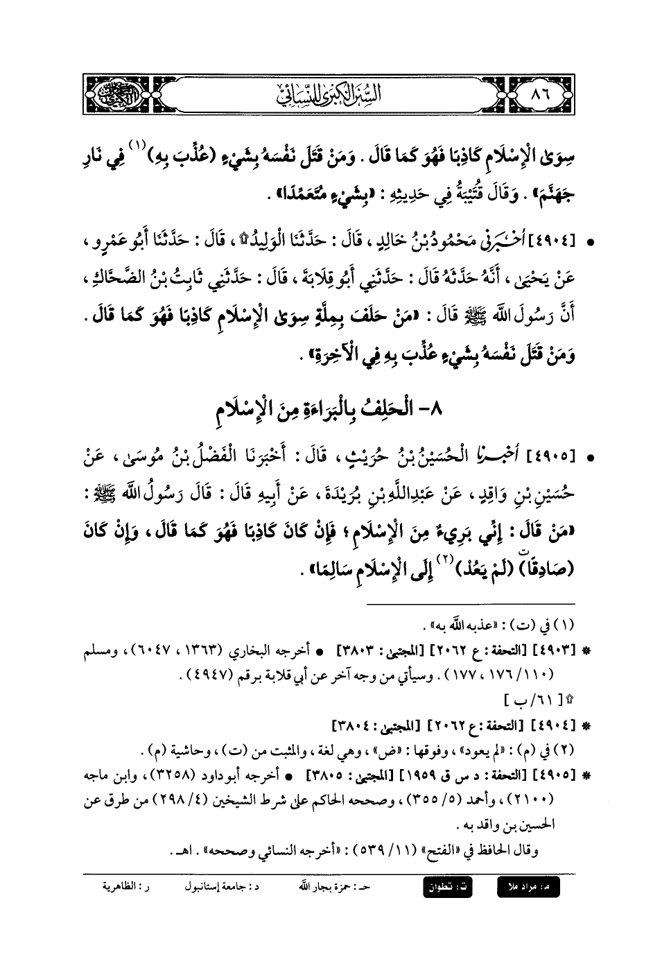 4905- أَخبَرنا الحُسَيْنُ بنُ حُرَيْثٍ، قَالَ: أَخبَرنا الفَضْلُ بنُ مُوسَى، عَن حُسَيْنِ بنِ وَاقِدٍ، عَن عَبدِ اللهِ بنِ بُرَيْدَةَ، عَن أَبيهِ، قَالَ: قَالَ رَسُولُ اللهِ صَلى الله عَلَيهِ وسَلم: مَنْ قَالَ إِنِّي بَرِيءٌ مِنَ الإِسلامِ، فَإِنْ كَانَ كَاذِبًا فَهُوَ كَمَا قَالَ، وَإِنْ كَانَ صَادِقًا لَمْ يَعُدْ إِلَى الإِسلامِ سَالِمًا.