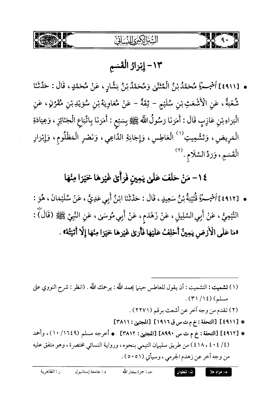 4911- أَخبَرنا مُحَمدُ بنُ المُثَنَّى، وَمُحَمدُ بنُ بَشَّارٍ، عَن مُحَمدٍ، قَالَ: حَدَّثنا شُعْبَةُ، عَنِ الأَشْعَثِ بنِ سُلَيْمٍ، ثِقَةٌ، عَن مُعاويَةَ بنِ سُوَيْدِ بنِ مُقَرِّنٍ، عَنِ البَرَاءِ بنِ عَازِبٍ، قَالَ: أَمَرَنَا رَسُولُ اللهِ صَلى الله عَلَيهِ وسَلم بِسَبْعٍ: أَمَرَنَا بِاتِّبَاعِ الجَنَائِزِ، وَعِيَادَةِ المَرِيضِ، وَتَشْمِيتِ العَاطِسِ، وَإِجَابَةِ الدَّاعِي، وَنَصْرِ المَظْلُومِ، وَإِبْرَارِ القَسَمِ، وَرَدِّ السَّلامِ.