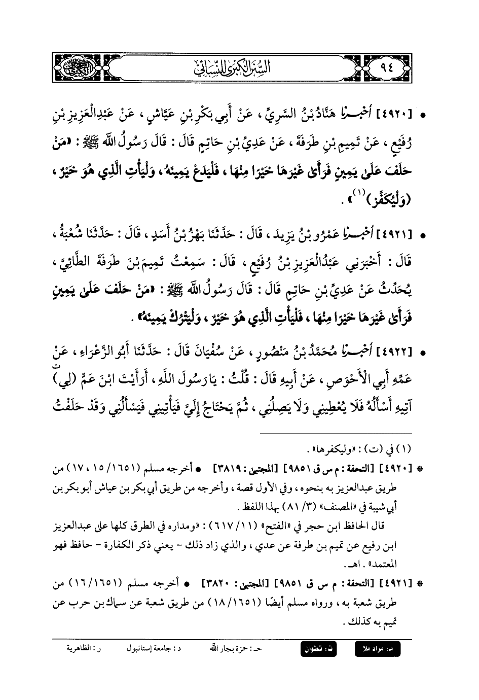 4921- أَخبَرنا عَمْرُو بنُ يَزِيدَ، قَالَ: حَدَّثنا بَهْزُ بنُ أَسْدٍ، قَالَ: حَدَّثنا شُعْبَةُ، قَالَ: أَخْبَرَنِي عَبدُ العَزِيزِ بنُ رُفَيْعٍ، قَالَ: سَمِعْتُ تَمِيمَ بْنَ طَرَفَةَ الطَّائِيَّ، يُحَدِّثُ عَن عَدِيِّ بنِ حَاتِمٍ، قَالَ: قَالَ رَسُولُ اللهِ صَلى الله عَلَيهِ وسَلم: مَنْ حَلَفَ عَلَى يَمِينٍ فَرَأَى غَيْرَهَا خَيْرًا مِنْهَا، فَلْيَأْتِ الَّذِي هُوَ خَيْرٌ، وَلْيَتْرُكْ يَمِينَهُ.