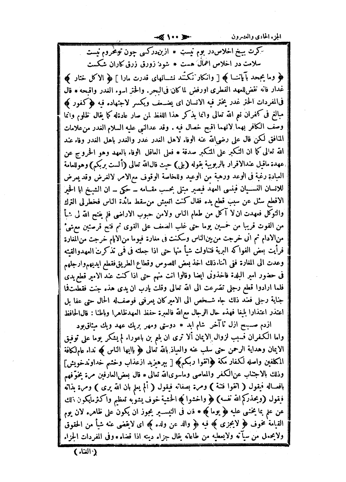 وَما يَجْحَدُ بِآياتِنا [وانكار نكنند نشانهاى قدرت ما را] إِلَّا كُلُّ خَتَّارٍ غدار فانه نقض للعهد الفطري او رفض لما كان فى البحر. والختر أسوأ الغدر واقبحه قال فى المفردات الختر غدر يختر فيه الإنسان اى يضعف ويكسر لاجتهاده فيه كَفُورٍ مبالغ فى كفران نعم الله تعالى وانما يذكر هذا اللفظ لمن صار عادة له كما يقال ظلوم وانما وصف الكافر بهما لانهما أقبح خصال فيه. وقد عد النبي عليه السلام الغدر من علامات المنافق لكن قال على رضى الله عنه الوفاء لاهل الغدر غدر والغدر باهل الغدر وفاء عند الله تعالى كما ان التكبر على المتكبر صدقة فعلى العاقل الوفاء بالعهد وهو الخروج عن عهدة ما قيل عند الإقرار بالربوبية بقوله (بَلى) حيث قال الله تعالى (أَلَسْتُ بِرَبِّكُمْ) وهو للعامة العبادة رغبة فى الوعد ورهبة من الوعيد وللخاصة الوقوف مع الأمر لا لغرض وقد يعرض للانسان النسيان فينسى العهد فيصير مبتلى بحسب مقامه- حكى- ان الشيخ أبا الخير الأقطع سئل عن سبب قطع يده فقال كنت أتعيش من سقط مائدة الناس فخطرلى الترك والتوكل فعهدت ان لا آكل من طعام الناس ولا من حبوب الأراضي فلم يفتح الله لى شيأ من القوت قريبا من خمسين يوما حتى غلب الضعف على القوى ثم فتح قرصتين مع شىء من الادام ثم انى خرجت من بين الناس وسكنت فى مغارة فيوما من الأيام خرجت من المغارة فرأيت بعض الفواكه البرية فتناولت شيأ منها حتى إذا جعلته فى فمى تذكرت العهد وألقيته وعدت الى المغارة ففى أثناء ذلك أخذ بعض اللصوص وقطاع الطريق فقطع أيديهم وأرجلهم فى حضور امير البلدة فاخذونى ايضا وقالوا أنت منهم حتى إذا كنت عند الأمير قطع يدى فلما أرادوا قطع رجلى تضرعت الى الله تعالى وقلت يا رب ان يدى هذه جنت فقطعت فما جناية رجلى فعند ذلك جاء شخص الى الأمير كان يعرفنى فوصف له الحال حتى عفا بل اعتذر اعتذارا بليغا فهذه حال الرجال مع الله فالعبرة حفظ العهد ظاهرا وباطنا: قال الحافظ