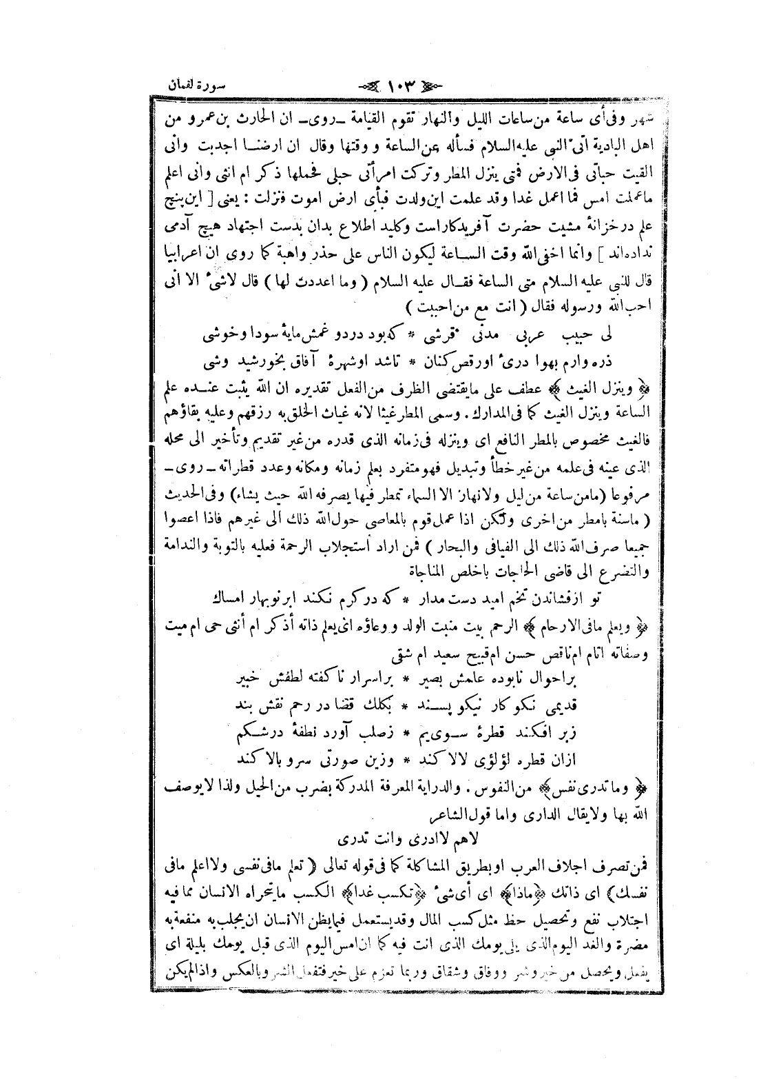 شهر وفى أي ساعة من ساعات الليل والنهار تقوم القيامة- روى- ان الحارث بن عمرو من اهل البادية اتى النبي عليه السلام فسأله عن الساعة ووقتها وقال ان ارضنا أجدبت وانى ألقيت حباتى فى الأرض فمتى ينزل المطر وتركت امرأتى حبلى فحملها ذكر أم أنثى وانى اعلم ما عملت أمس فما اعمل غدا وقد عملت اين ولدت فبأى ارض أموت فنزلت: يعنى [اين پنج علم در خزانه مشيت حضرت آفريدگار است وكليد اطلاع بدان بدست اجتهاد هيچ آدمي نداده اند] وانما أخفى الله وقت الساعة ليكون الناس على حذر واهبة كما روى ان أعرابيا قال للنبى عليه السلام متى الساعة فقال عليه السلام (وما اعددت لها) قال لا شىء الا انى أحب الله ورسوله فقال (أنت مع من أحببت)