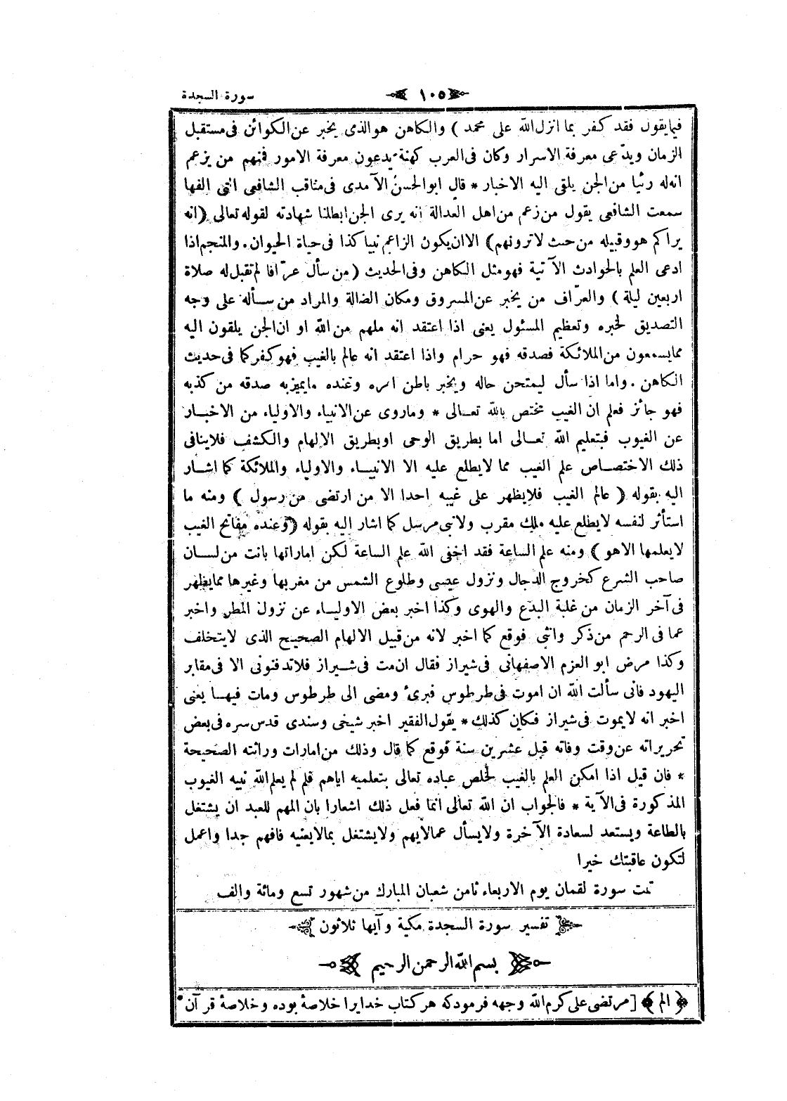 فيما يقول فقد كفر بما انزل الله على محمد) والكاهن هو الذي يخبر عن الكوائن فى مستقبل الزمان ويدّعى معرفة الاسرار وكان فى العرب كهنة يدعون معرفة الأمور فمنهم من يزعم انه له رئيا من الجن يلقى اليه الاخبار قال ابو الحسن الآمدى فى مناقب الشافعي التي الفها سمعت الشافعي يقول من زعم من اهل العدالة انه يرى الجن أبطلنا شهادته لقوله تعالى (إِنَّهُ يَراكُمْ هُوَ وَقَبِيلُهُ مِنْ حَيْثُ لا تَرَوْنَهُمْ) الا ان يكون الزاعم نبيا كذا فى حياة الحيوان. والمنجم إذا ادعى العلم بالحوادث الآتية فهو مثل الكاهن وفى الحديث (من سأل عرّافا لم تقبل له صلاة أربعين ليلة) والعرّاف من يخبر عن المسروق ومكان الضالة والمراد من سأله على وجه التصديق لخبره وتعظيم المسئول يعنى إذا اعتقد انه ملهم من الله او ان الجن يلقون اليه مما يسمعون من الملائكة فصدقه فهو حرام وإذا اعتقد انه عالم بالغيب فهو كفر كما فى حديث الكاهن. واما إذا سأل ليمتحن حاله ويخبر باطن امره وعنده ما يميز به صدقه من كذبه فهو جائز فعلم ان الغيب مختص بالله تعالى وما روى عن الأنبياء والأولياء من الاخبار عن الغيوب فبتعليم الله تعالى اما بطريق الوحى او بطريق الإلهام والكشف فلا ينافى ذلك الاختصاص علم الغيب مما لا يطلع عليه الا الأنبياء والأولياء والملائكة كما أشار اليه بقوله (عالِمُ الْغَيْبِ فَلا يُظْهِرُ عَلى غَيْبِهِ أَحَداً إِلَّا مَنِ ارْتَضى مِنْ رَسُولٍ) ومنه ما استأثر لنفسه لا يطلع عليه ملك مقرب ولا نبى مرسل كما أشار اليه بقوله (وَعِنْدَهُ مَفاتِحُ الْغَيْبِ لا يَعْلَمُها إِلَّا هُوَ) ومنه علم الساعة فقد أخفى الله علم الساعة لكن اماراتها بانت من لسان صاحب الشرع كخروج الدجال ونزول عيسى وطلوع الشمس من مغربها وغيرها مما يظهر فى آخر الزمان من غلبة البدع والهوى وكذا اخبر بعض الأولياء عن نزول المطر واخبر عما فى الرحم من ذكر وأنثى فوقع كما اخبر لانه من قبيل الإلهام الصحيح الذي لا يتخلف وكذا مرض ابو العزم الاصفهانى فى شيراز فقال ان مت فى شيراز فلا تدفنونى الا فى مقابر اليهود فانى سألت الله ان أموت فى طرطوس فبرىء ومضى الى طرطوس ومات فيها يعنى اخبر انه لا يموت فى شيراز فكان كذلك يقول الفقير اخبر شيخى وسندى قدس سره فى بعض تحريراته عن وقت وفاته قبل عشرين سنة فوقع كما قال وذلك من امارات وراثته الصحيحة فان قيل إذا أمكن العلم بالغيب لخلص عباده تعالى بتعلميه إياهم فلم لم يعلم الله نبيه الغيوب المذكورة فى الآية فالجواب ان الله تعالى انما فعل ذلك اشعارا بان المهم للعبد ان يشتغل بالطاعة ويستعد لسعادة الآخرة ولا يسأل عما لا يهم ولا يشتغل بما لا يعنيه فافهم جدا واعمل لتكون عاقبتك خيرا تمت سورة لقمان يوم الأربعاء ثامن شعبان المبارك من شهور تسع ومائة والف