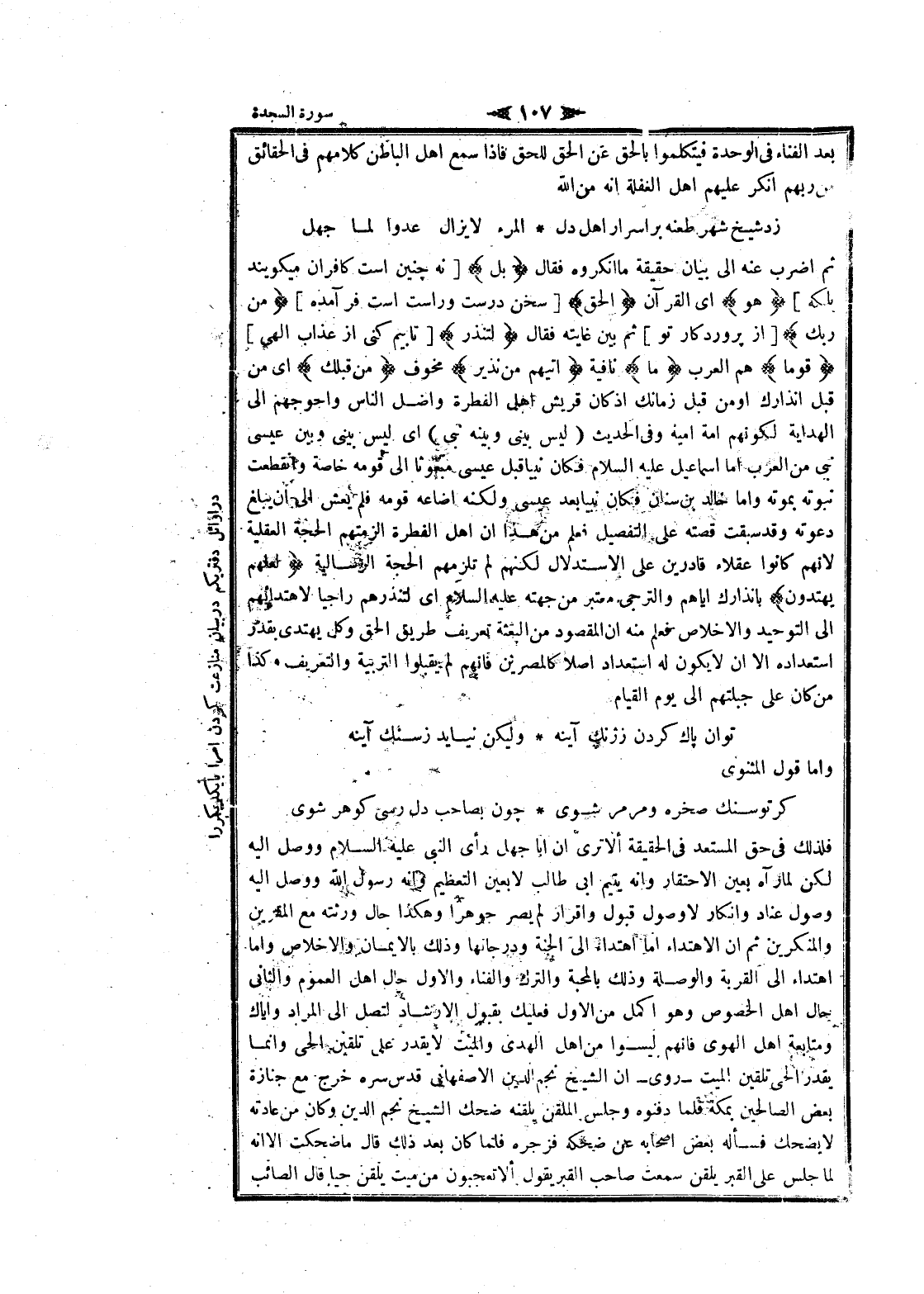 فلذلك فى حق المستعد فى الحقيقة ألا ترى ان أبا جهل رأى النبي عليه السلام ووصل اليه لكن لما رآه بعين الاحتقار وانه يتيم ابى طالب لابعين التعظيم وانه رسول الله ووصل اليه وصول عناد وانكار لا وصول قبول واقرار لم يصر جوهرا وهكذا حال ورثته مع المقرين والمنكرين ثم ان الاهتداء اما اهتداء الى الجنة ودرجاتها وذلك بالايمان والإخلاص واما اهتداء الى القربة والوصلة وذلك بالمحبة والترك والفناء والاول حال اهل العموم والثاني حال اهل الخصوص وهو أكمل من الاول فعليك بقبول الإرشاد لتصل الى المراد وإياك ومتابعة اهل الهوى فانهم ليسوا من اهل الهدى والميت لا يقدر على تلقين الحي وانما يقدر الحي تلقين الميت- روى- ان الشيخ نجم الدين الاصفهانى قدس سره خرج مع جنازة بعض الصالحين بمكة فلما دفنوه وجلس الملقن يلقنه ضحك الشيخ نجم الدين وكان من عادته لا يضحك فسأله بعض أصحابه عن ضحكه فزجره فلما كان بعد ذلك قال ما ضحكت الا انه لما جلس على القبر يلقن سمعت صاحب القبر يقول ألا تعجبون من ميت يلقن حيا قال الصائب