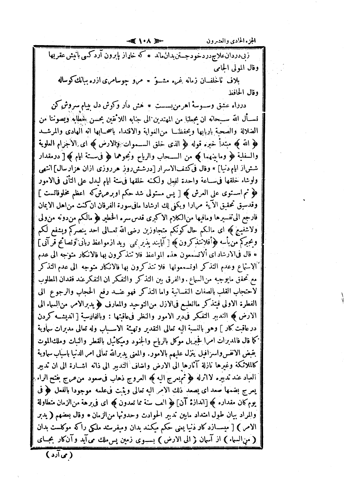 نسأل الله سبحانه ان يجعلنا من المهتدين الى جنابه اللائقين بحسن خطابه ويصوننا من الضلالة والصحبة باربابها ويحفظنا من الغواية والاقتداء بأصحابها انه الهادي والمرشد اللَّهُ مبتدأ خبره قوله الَّذِي خَلَقَ السَّماواتِ وَالْأَرْضَ اى الاجرام العلوية والسفلية وَما بَيْنَهُما من السحاب والرياح ونحوهما فِي سِتَّةِ أَيَّامٍ [در مقدار شش از ايام دنيا] وقال فى كشف الاسرار [در شش روز هر روزى از آن هزار سال] انتهى ولو شاء خلقها فى ساعة واحدة لفعل ولكنه خلقها فى ستة ايام ليدل على التأنى فى الأمور ثُمَّ اسْتَوى عَلَى الْعَرْشِ [پس مستولى شد حكم او بر عرش كه أعظم مخلوقاتست] وقد سبق تحقيق الآية مرارا ويكفى لك إرشادا ما فى سورة الفرقان ان كنت من اهل الايمان فارجع الى تفسيرها وما فيها من الكلام الاكبرى قدس سره الخطير ما لَكُمْ مِنْ دُونِهِ مِنْ وَلِيٍّ وَلا شَفِيعٍ اى ما لكم حال كونكم متجاوزين رضى الله تعالى أحد ينصركم ويشفع لكم ويجيركم من بأسه أَفَلا تَتَذَكَّرُونَ [آيا پندپذير نمى شويد از مواعظ ربانى ونصائح قرآنى] قال فى الإرشاد اى ألا تسمعون هذه المواعظ فلا تتذكرون بها فالانكار متوجه الى عدم الاستماع وعدم التذكر او تسمعونها فلا تتذكرون بها فالانكار متوجه الى عدم التذكر مع تحقق ما يوجبه من السماع. والفرق بين التذكر والتفكر ان التفكر عند فقدان المطلوب لاحتجاب القلب بالصفات النفسانية واما التذكر فهو عند رفع الحجاب والرجوع الى الفطرة الاولى فيتذكر ما انطبع فى الأزل من التوحيد والمعارف يُدَبِّرُ الْأَمْرَ مِنَ السَّماءِ إِلَى الْأَرْضِ التدبير التفكر فى دبر الأمور والنظر فى عاقبتها: وبالفارسية [انديشه كردن در عاقبت كار] وهو بالنسبة اليه تعالى التقدير وتهيئة الأسباب وله تعالى مدبرات سماوية كما قال فالمدبرات امرا فجبريل موكل بالرياح والجنود وميكائيل بالقطر والنبات وملك الموت بقبض الأنفس واسرافيل ينزل عليهم بالأمور. والمعنى يدبر الله تعالى امر الدنيا بأسباب سماوية كالملائكة وغيرها نازلة آثارها الى الأرض وأضاف التدبير الى ذاته اشارة الى ان تدبير العباد عند تدبيره لا اثر له ثُمَّ يَعْرُجُ إِلَيْهِ العروج ذهاب فى صعود من عرج بفتح الراء يعرج بضمها صعد اى يصعد ذلك الأمر اليه تعالى ويثبت فى علمه موجودا بالفعل فِي يَوْمٍ كانَ مِقْدارُهُ [اندازه آن] أَلْفَ سَنَةٍ مِمَّا تَعُدُّونَ اى فى برهة من الزمان متطاولة والمراد بيان طول امتداد ما بين تدبير الحوادث وحدوثها من الزمان وقال بعضهم (يُدَبِّرُ الْأَمْرَ) [ميسازد كار دنيا يعنى حكم ميكند بدان وميفرستد ملكى را كه موكلست بدان (مِنَ السَّماءِ) از آسمان (إِلَى الْأَرْضِ) بسوى زمين پس ملك مى آيد وآن كار بجاى