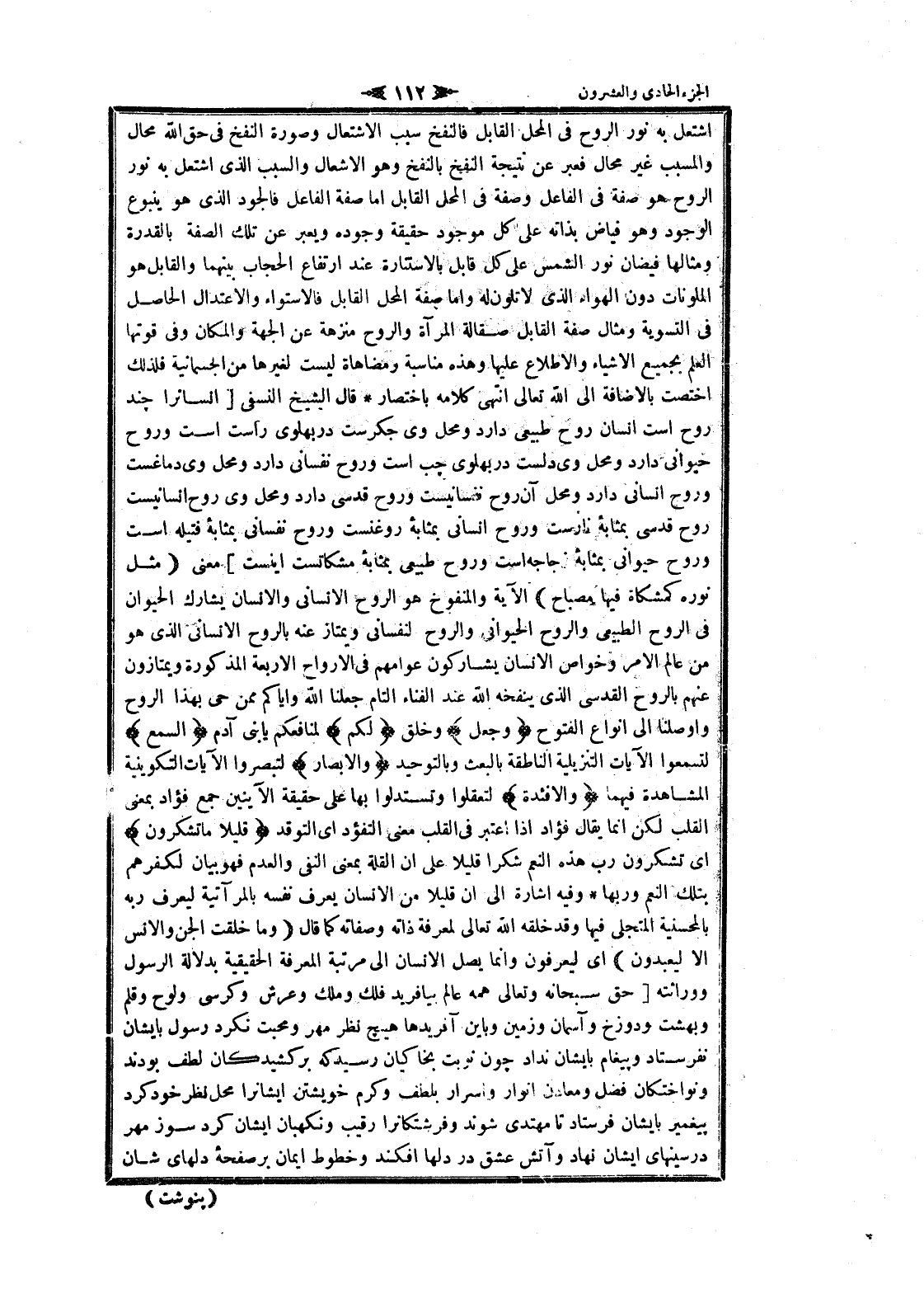 اشتعل به نور الروح فى المحل القابل فالنفخ سبب الاشتعال وصورة النفخ فى حق الله محال والمسبب غير محال فعبر عن نتيجة النفخ بالنفخ وهو الاشعال والسبب الذي اشتعل به نور الروح هو صفة فى الفاعل وصفة فى المحل القابل اما صفة الفاعل فالجود الذي هو ينبوع الوجود وهو فياض بذاته على كل موجود حقيقة وجوده ويعبر عن تلك الصفة بالقدرة ومثالها فيضان نور الشمس على كل قابل بالاستنارة عند ارتفاع الحجاب بينهما والقابل هو الملونات دون الهواء الذي لا تلون له واما صفة المحل القابل فالاستواء والاعتدال الحاصل فى التسوية ومثال صفة القابل صقالة المرآة والروح منزهة عن الجهة والمكان وفى قوتها العلم بجميع الأشياء والاطلاع عليها وهذه مناسبة ومضاهاة ليست لغيرها من الجسمانية فلذلك اختصت بالاضافة الى الله تعالى انتهى كلامه باختصار قال الشيخ النسفي [انسان را چند روح است انسان