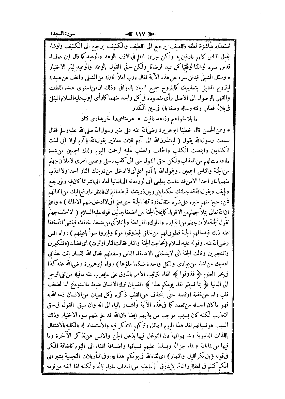 استعداد مباشرة لطفه فاللطيف يرجع الى اللطيف والكثيف يرجع الى الكثيف ولو شاء لجعل الناس كلهم عارفين به ولكن جرى القلم فى الأزل بالوعد والوعيد كما قال ابن عطاء قدس سره لو شئنا لوفقنا كل عبد لرضانا ولكن حق القول بالوعد والوعيد ليتم الاختيار وسئل الشبلي قدس سره عن هذه الآية فقال يا رب املأ نارك من الشبلي واعف عن عبيدك ليتروح الشبلي بتعذيبك كما يتروح جميع العباد بالعوافي وذلك ان من استوى عنده اللطف والقهر بالوصول الى الأصل رأى مقصوده فى كل واحد منهما كما رأى أيوب عليه السلام المبتلى فى بلائه فطاب وقته وحاله وصفا باله فى عين الكدر
