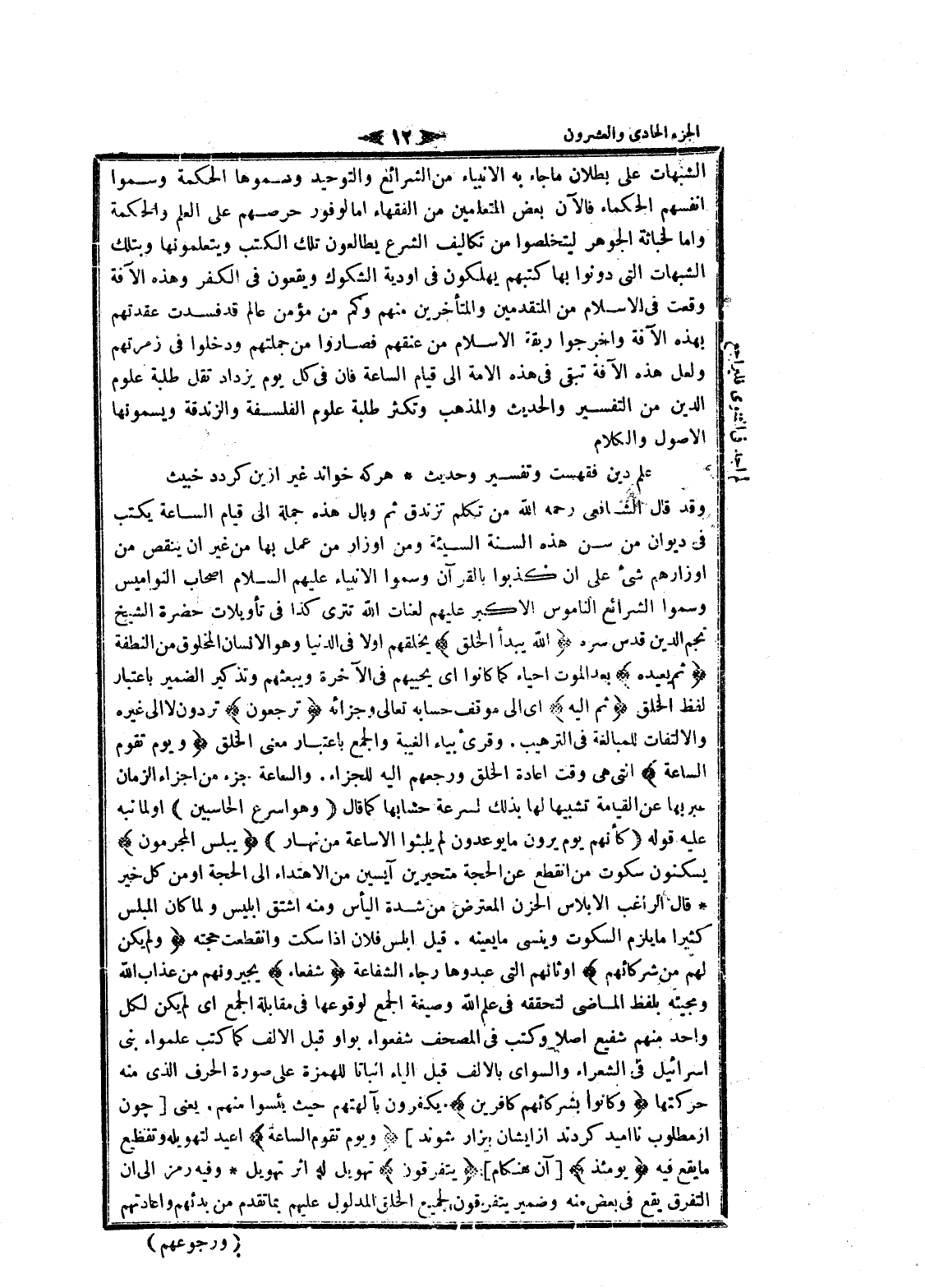 الشبهات على بطلان ما جاء به الأنبياء من الشرائع والتوحيد وسموها الحكمة وسموا أنفسهم الحكماء فالآن بعض المتعلمين من الفقهاء اما لوفور حرصهم على العلم والحكمة واما لخباثة الجوهر ليتخلصوا من تكاليف الشرع يطالعون تلك الكتب ويتعلمونها وبتلك الشبهات التي دونوا بها كتبهم يهلكون فى اودية الشكوك ويقعون فى الكفر وهذه الآفة وقعت فى الإسلام من المتقدمين والمتأخرين منهم وكم من مؤمن عالم قد فسدت عقدتهم بهذه الآفة واخرجوا ربقة الإسلام من عنقهم فصاروا من جملتهم ودخلوا فى زمرتهم ولعل هذه الآفة تبقى فى هذه الامة الى قيام الساعة فان فى كل يوم يزداد تقل طلبة علوم الدين من التفسير والحديث والمذهب وتكثر طلبة علوم الفلسفة والزندقة ويسمونها الأصول والكلام
