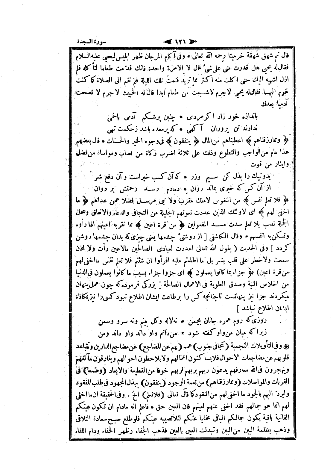 وفى التأويلات النجمية (تَتَجافى جُنُوبُهُمْ عَنِ الْمَضاجِعِ) عن مضاجع الدارين وتتباعد قلوبهم عن مضاجعات الأحوال فلا يساكنون أعمالهم ولا يلاحظون أحوالهم ويفارقون مآلفهم ويهجرون فى الله معارفهم يدعون ربهم بربهم لربهم خوفا من القطيعة والابعاد (وَطَمَعاً) فى القربات والمواصلات (وَمِمَّا رَزَقْناهُمْ) من نعمة الوجود (يُنْفِقُونَ) ببذل المجهود فى طلب المفقود وليردّ إليهم بالجود ما أخفى لهم من النقود كما قال تعالى (فَلا تَعْلَمُ) إلخ. وفى الحقيقة ان ما أخفى لهم انما هو جمالهم فقد أخفى عنهم لعينهم فان العين حق فاعلم انه مادام ان تكون عينكم الفانية باقية يكون جمالكم الباقي مخفيا عنكم لئلا تصيبه عينكم فلو طلع صبح سعادة التلاقي وذهب بظلمة البين من البين وتبدلت العين بالعين فذهب الجفاء وظهر الخفاء ودام اللقاء