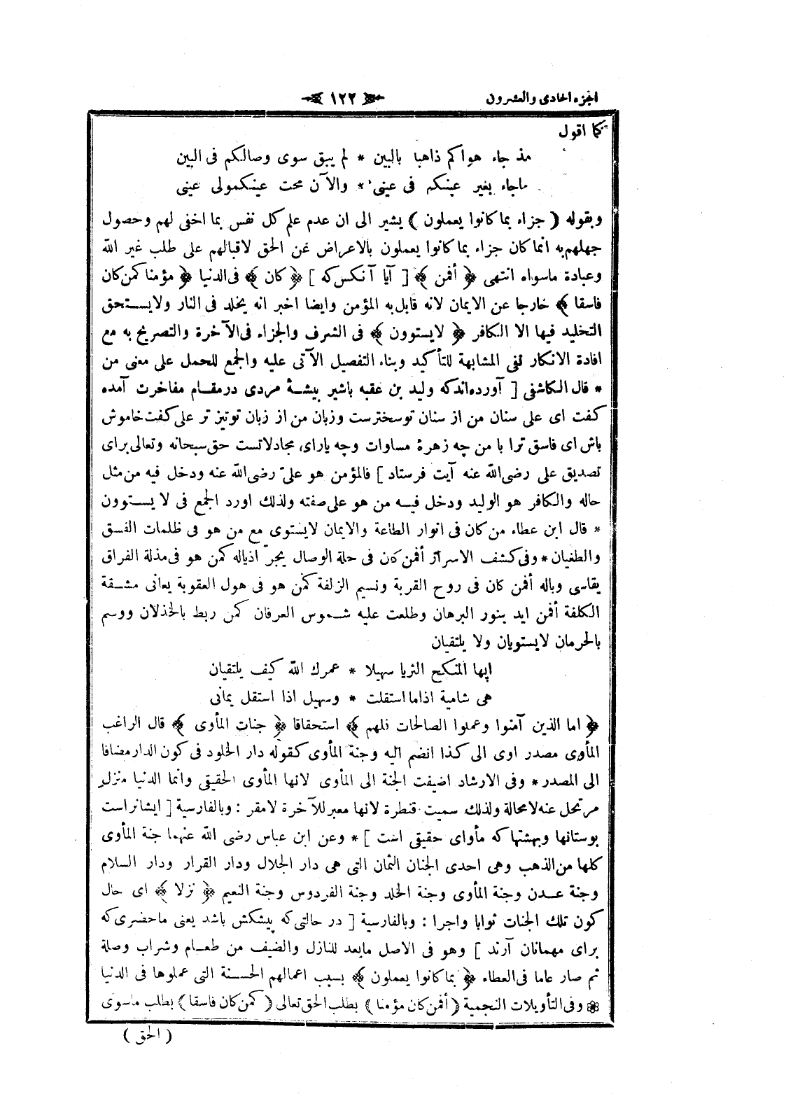أَمَّا الَّذِينَ آمَنُوا وَعَمِلُوا الصَّالِحاتِ فَلَهُمْ استحقاقا جَنَّاتُ الْمَأْوى قال الراغب المأوى مصدر أوى الى كذا انضم اليه وجنة المأوى كقوله دار الخلود فى كون الدار مضافا الى المصدر وفى الإرشاد أضيفت الجنة الى المأوى لانها المأوى الحقيقي وانما الدنيا منزل مرتحل عنه لا محالة ولذلك سميت قنطرة لانها معبر للآخرة لا مقر: وبالفارسية [ايشانراست بوستانها وبهشتها كه مأواى حقيقى است] وعن ابن عباس رضى الله عنهما جنة المأوى كلها من الذهب وهى احدى الجنان الثمان التي هى دار الجلال ودار القرار ودار السلام وجنة عدن وجنة المأوى وجنة الخلد وجنة الفردوس وجنة النعيم نُزُلًا اى حال كون تلك الجنات ثوابا واجرا: وبالفارسية [در حالتى كه پيشكش باشد يعنى ماحضرى كه براى مهمانان آرند] وهو فى الأصل ما يعد للنازل والضيف من طعام وشراب وصلة ثم صار عاما فى العطاء بِما كانُوا يَعْمَلُونَ بسبب أعمالهم الحسنة التي عملوها فى الدنيا وفى التأويلات النجمية (أَفَمَنْ كانَ مُؤْمِناً) بطلب الحق تعالى (كَمَنْ كانَ فاسِقاً) بطلب ما سوى