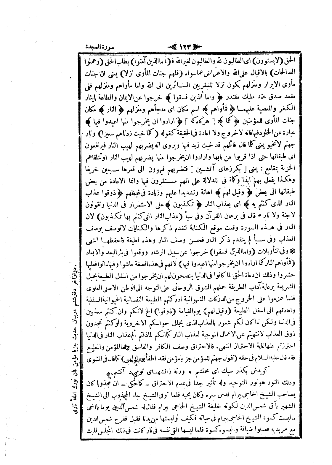 الحق (لا يَسْتَوُونَ) اى الطالبون لله والطالبون لغير الله ف (أَمَّا الَّذِينَ آمَنُوا) بطلب الحق (وَعَمِلُوا الصَّالِحاتِ) بالإقبال على الله والاعراض عما سواه (فَلَهُمْ جَنَّاتُ الْمَأْوى نُزُلًا) يعنى ان جنات مأوى الأبرار ومنزلهم يكون نزلا للمقربين السائرين الى الله واما مأواهم ومنزلهم ففى مقعد صدق عند مليك مقتدر وَأَمَّا الَّذِينَ فَسَقُوا خرجوا عن الايمان والطاعة بايثار الكفر والمعصية عليهما فَمَأْواهُمُ اسم مكان اى ملجأهم ومنزلهم النَّارُ مكان جنات المأوى للمؤمنين كُلَّما [هركاه كه] أَرادُوا أَنْ يَخْرُجُوا مِنْها أُعِيدُوا فِيها عبارة عن الخلود فيها فانه لا خروج ولا إعادة فى الحقيقة كقوله (كُلَّما خَبَتْ زِدْناهُمْ سَعِيراً) ونار جهنم لا تخبو يعنى كلما قال قائلهم قد خبت زيد فيها ويروى انه يضربهم لهيب النار فيرتفعون الى طبقاتها حتى إذا قربوا من بابها وأرادوا ان يخرجوا منها يضربهم لهيب النار او تتلقاهم الخزنة بمقامع: يعنى [بگرزهاى آتشين] فتضربهم فيهوون الى قعرها سبعين خريفا وهكذا يفعل بهم ابدا وكلمة فى للدلالة على انهم مستقرون فيها وانما الاعادة من بعض طبقاتها الى بعض وَقِيلَ لَهُمْ اهانة وتشديدا عليهم وزيادة فى غيظهم ذُوقُوا عَذابَ النَّارِ الَّذِي كُنْتُمْ بِهِ اى بعذاب النار تُكَذِّبُونَ على الاستمرار فى الدنيا وتقولون لا جنة ولا نار قال فى برهان القرآن وفى سبأ (عَذابَ النَّارِ الَّتِي كُنْتُمْ بِها تُكَذِّبُونَ) لان النار فى هذه السورة وقعت موقع الكناية لتقدم ذكرها والكنايات لا توصف بوصف العذاب وفى سبأ لم يتقدم ذكر النار فحسن وصف النار وهذه لطيفة فاحفظها انتهى وفى التأويلات (وَأَمَّا الَّذِينَ فَسَقُوا) خرجوا عن سبيل الرشاد ووقعوا فى بئر البعد والابعاد (فَمَأْواهُمُ النَّارُ كُلَّما أَرادُوا أَنْ يَخْرُجُوا مِنْها أُعِيدُوا فِيها) لانهم فى هذه الصفة عاشوا وفيها ماتوا فعليها حشروا وذلك ان دعاة الحق لما كانوا فى الدنيا ينصحون لهم ان يخرجوا من أسفل الطبيعة بحبل الشريعة برعاية آداب الطريقة حملهم الشوق الروحاني على التوجه الى الوطن الأصلي العلوي فلما عزموا على الخروج من الدركات الشهوانية أدركتهم الطبيعة النفسانية الحيوانية السفلية واعادتهم الى أسفل الطبيعة (وَقِيلَ لَهُمْ) يوم القيامة (ذُوقُوا) إلخ لانكم وان كنتم معذبين فى الدنيا ولكن ما كان لكم شعور بالعذاب الذي يجلل حواسكم الاخروية ولو كنتم تجدون ذوق العذاب لانتهيتم عن الأعمال الموجبة لعذاب النار كما انكم لماذقتم ألم عذاب النار فى الدنيا احترزتم عنها غاية الاحتراز انتهى. فالاحتراق وصف الكافر والفاسق واما المؤمن والمطيع فقد قال عليه السلام فى حقه (تقول جهنم للمؤمن جزيا مؤمن فقد اطفأ نورك لهبى) كما قال فى المثنوى
