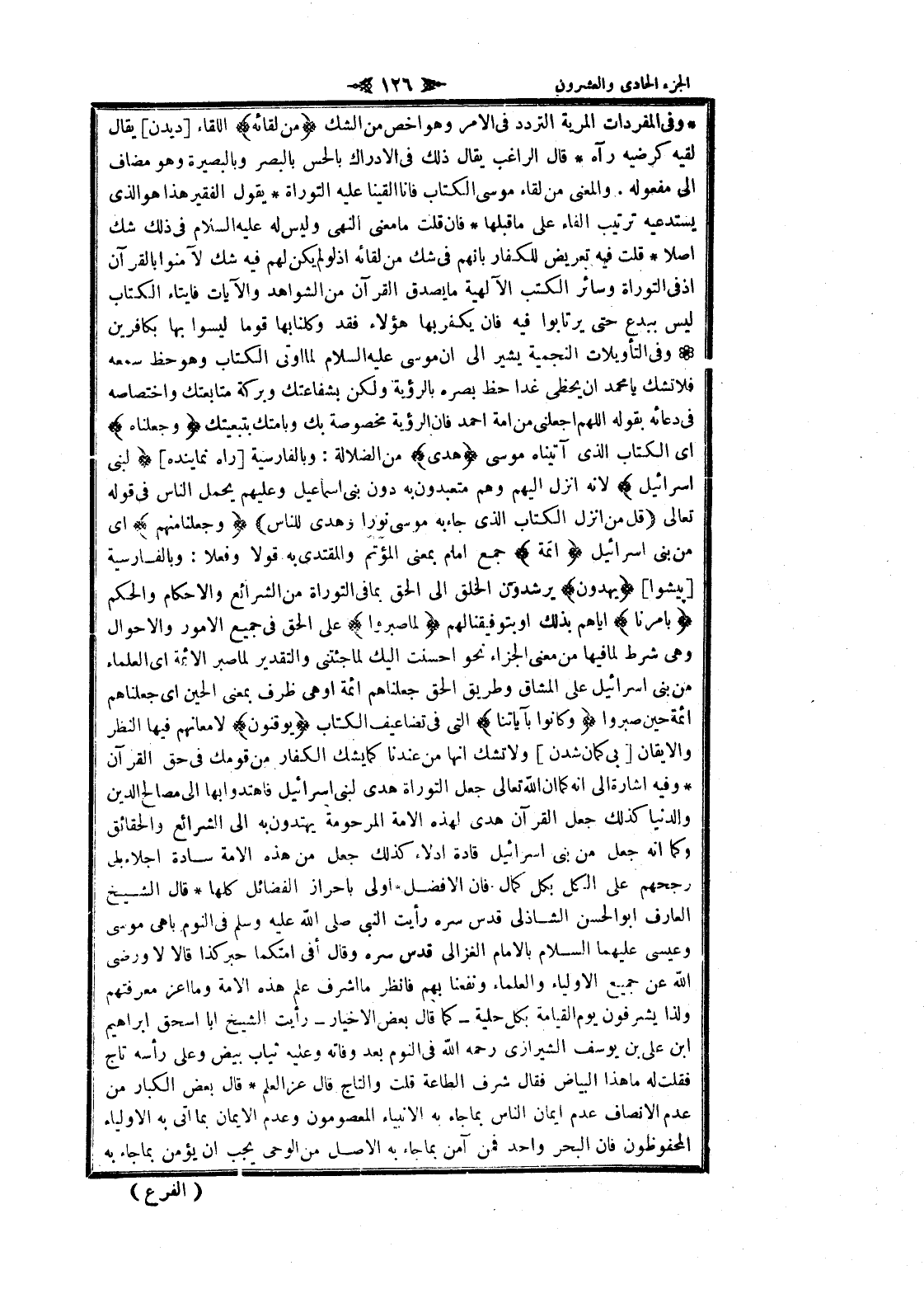 وفى المفردات المرية التردد فى الأمر وهو أخص من الشك مِنْ لِقائِهِ اللقاء [ديدن] يقال لقيه كرضيه رآه قال الراغب يقال ذلك فى الإدراك بالحس بالبصر وبالبصيرة وهو مضاف الى مفعوله. والمعنى من لقاء موسى الكتاب فانا ألقينا عليه التوراة يقول الفقير هذا هو الذي يستدعيه ترتيب الفاء على ما قبلها فان قلت ما معنى النهى وليس له عليه السلام فى ذلك شك أصلا قلت فيه تعريض للكفار بانهم فى شك من لقائه إذ لو لم يكن لهم فيه شك لآمنوا بالقرآن إذ فى التوراة وسائر الكتب الإلهية ما يصدق القرآن من الشواهد والآيات فايتاء الكتاب ليس ببدع حتى يرتابوا فيه فان يكفر بها هؤلاء فقد وكلنا بها قوما ليسوا بها بكافرين وفى التأويلات النجمية يشير الى ان موسى عليه السلام لما اوتى الكتاب وهو حظ سمعه فلا تشك يا محمد ان يحظى غدا حظ بصره بالرؤية ولكن بشفاعتك وبركة متابعتك واختصاصه فى دعائه بقوله اللهم اجعلنى من امة احمد فان الرؤية مخصوصة بك وبامتك بتبعيتك وَجَعَلْناهُ اى الكتاب الذي آتيناه موسى هُدىً من الضلالة: وبالفارسية [راه نماينده] لِبَنِي إِسْرائِيلَ لانه انزل إليهم وهم متعبدون به دون بنى إسماعيل وعليهم يحمل الناس فى قوله تعالى (قُلْ مَنْ أَنْزَلَ الْكِتابَ الَّذِي جاءَ بِهِ مُوسى نُوراً وَهُدىً لِلنَّاسِ) وَجَعَلْنا مِنْهُمْ اى من بنى إسرائيل أَئِمَّةً جمع امام بمعنى المؤتم والمقتدى به قولا وفعلا: وبالفارسية [پيشوا] يَهْدُونَ يرشدون الخلق الى الحق بما فى التوراة من الشرائع والاحكام والحكم بِأَمْرِنا إياهم بذلك او بتوفيقنا لهم لَمَّا صَبَرُوا على الحق فى جميع الأمور والأحوال وهى شرط لما فيها من معنى الجزاء نحو أحسنت إليك لما جئتنى والتقدير لما صبر الائمة اى العلماء من بنى إسرائيل على المشاق وطريق الحق جعلناهم ائمة او هى ظرف بمعنى الحين اى جعلناهم ائمة حين صبروا وَكانُوا بِآياتِنا التي فى تضاعيف الكتاب يُوقِنُونَ لا معانهم فيها النظر والإيقان [بى گمان شدن] ولا تشك انها من عندنا كما يشك الكفار من قومك فى حق القرآن وفيه اشارة الى انه كما ان الله تعالى جعل التوراة هدى لبنى إسرائيل فاهتدوا بها الى مصالح الدين والدنيا كذلك جعل القرآن هدى لهذه الامة المرحومة يهتدون به الى الشرائع والحقائق وكما انه جعل من بنى إسرائيل قادة ادلاء كذلك جعل من هذه الامة سادة اجلاء بل رجحهم على الكل بكل كمال فان الأفضل اولى بإحراز الفضائل كلها قال الشيخ العارف ابو الحسن الشاذلى قدس سره رأيت النبي صلى الله عليه وسلم فى النوم باهى موسى وعيسى عليهما السلام بالإمام الغزالي قدس سره وقال أفي امتكما حبر كذا قالا لا ورضى الله عن جميع الأولياء والعلماء ونفعنا بهم فانظر ما اشرف علم هذه الامة وما أعز معرفتهم ولذا يشرفون يوم القيامة بكل حلية- كما قال بعض الأخيار- رأيت الشيخ أبا اسحق ابراهيم ابن على بن يوسف الشيرازي رحمه الله فى النوم بعد وفاته وعليه ثياب بيض وعلى رأسه تاج فقلت له ما هذا البياض فقال شرف الطاعة قلت والتاج قال عز العلم قال بعض الكبار من عدم الانصاف عدم ايمان الناس بما جاء به الأنبياء المعصومون وعدم الايمان بما اتى به الأولياء المحفوظون فان البحر واحد فمن آمن بما جاء به الأصل من الوحى يجب ان يؤمن بما جاء به