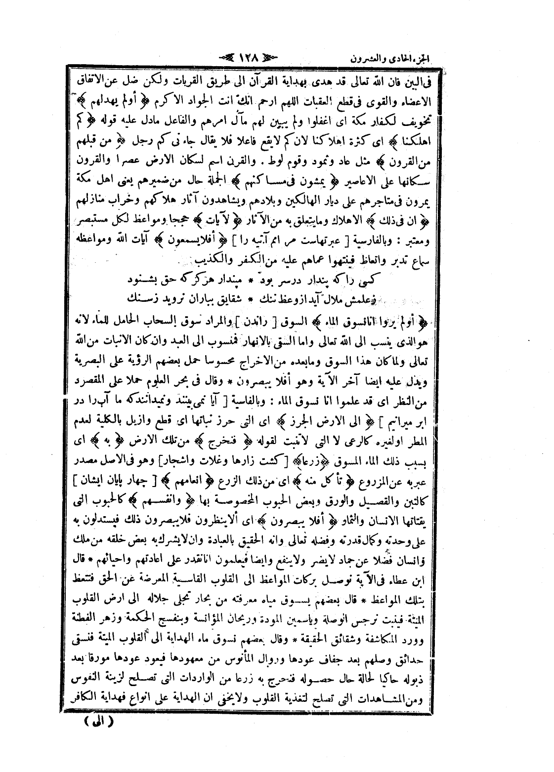 أَوَلَمْ يَرَوْا أَنَّا نَسُوقُ الْماءَ السوق [راندن] والمراد سوق السحاب الحامل للماء لانه هو الذي ينسب الى الله تعالى واما السقي بالأنهار فمنسوب الى العبد وان كان الإنبات من الله تعالى ولما كان هذا السوق وما بعده من الإخراج محسوسا حمل بعضهم الرؤية على البصرية ويدل عليه ايضا آخر الآية وهو أفلا يبصرون وقال فى بحر العلوم حملا على المقصود من النظر اى قد علموا انا نسوق الماء: وبالفارسية [آيا نمى بينند ونميدانند كه ما آب را در ابر ميرانيم] إِلَى الْأَرْضِ الْجُرُزِ اى التي حرز نباتها اى قطع وازيل بالكلية لعدم المطر او لغيره كالرعى لا التي لا تنبت لقوله فَنُخْرِجُ من تلك الأرض بِهِ اى بسبب ذلك الماء المسوق زَرْعاً [كشت زارها وغلات وأشجار] وهو فى الأصل مصدر عبر به عن المزروع تَأْكُلُ مِنْهُ اى من ذلك الزرع أَنْعامُهُمْ [چهارپايان ايشان] كالتبن والقصيل والورق وبعض الحبوب المخصوصة بها وَأَنْفُسُهُمْ كالحبوب التي يقتاتها الإنسان والثمار أَفَلا يُبْصِرُونَ اى ألا ينظرون فلا يبصرون ذلك فيستدلون به على وحدته وكمال قدرته وفضله تعالى وانه الحقيق بالعبادة وان لا يشرك به بعض خلقه من ملك وانسان فضلا عن جماد لا يضر ولا ينفع وايضا فيعلمون انا نقدر على اعادتهم واحيائهم قال ابن عطاء فى الآية نوصل بركات المواعظ الى القلوب القاسية المعرضة عن الحق فتتعظ بتلك المواعظ قال بعضهم يسوق مياه معرفته من بحار تجلى جلاله الى ارض القلوب الميتة فينبت نرجس الوصلة وياسمين المودة وريحان المؤانسة وبنفسج الحكمة وزهر الفطنة وورد المكاشفة وشقائق الحقيقة وقال بعضهم نسوق ماء الهداية الى القلوب الميتة فنسقى حدائق وصلهم بعد جفاف عودها وزوال المأنوس من معهودها فيعود عودها مورقا بعد ذبوله حاكيا لحالة حال حصوله فنخرج به زرعا من الواردات التي تصلح لزينة النفوس ومن المشاهدات التي تصلح لتغذية القلوب ولا يخفى ان الهداية على انواع فهداية الكافر