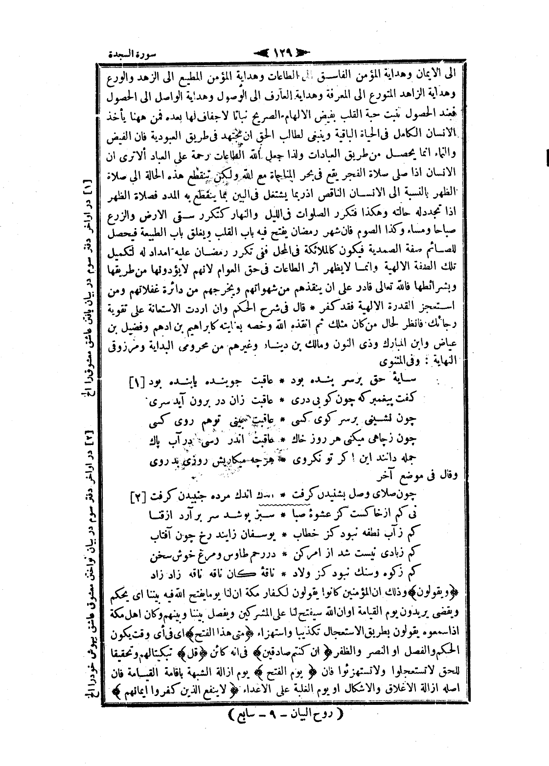 الى الايمان وهداية المؤمن الفاسق الى الطاعات وهداية المؤمن المطيع الى الزهد والورع وهداية الزاهد المتورع الى المعرفة وهداية العارف الى الوصول وهداية الواصل الى الحصول فعند الحصول تنبت حبة القلب بفيض الإلهام الصريح نباتا لا جفاف لها بعده فمن هاهنا يأخذ الإنسان الكامل فى الحياة الباقية وينبغى لطالب الحق ان يجتهد فى طريق العبودية فان الفيض والنماء انما يحصل من طريق العبادات ولذا جعل الله الطاعات رحمة على العباد ألا ترى ان الإنسان إذا صلى صلاة الفجر يقع فى بحر المناجاة مع الله ولكن تنقطع هذه الحالة الى صلاة الظهر بالنسبة الى الإنسان الناقص إذ ربما يشتغل فى البين بما ينقطع به المدد فصلاة الظهر إذا تجدد له حالته وهكذا فتكرر الصلوات فى الليل والنهار كتكرر سقى الأرض والزرع صباحا ومساء وكذا الصوم فان شهر رمضان يفتح فيه باب القلب ويغلق باب الطبيعة فيحصل للصائم صفة الصمدية فيكون كالملائكة فى المحل ففى تكرر رمضان عليه امداد له لتكميل تلك الصفة الالهية وانما لا يظهر اثر الطاعات فى حق العوام لانهم لا يؤدونها من طريقها وبشرائطها فالله تعالى قادر على ان ينقذهم من شهواتهم ويخرجهم من دائرة غفلاتهم ومن استعجز القدرة الالهية فقد كفر قال فى شرح الحكم وان أردت الاستعانة على تقوية رجائك فانظر لحال من كان مثلك ثم أنقذه الله وخصه بعنايته كابراهيم بن أدهم وفضيل بن عياض وابن المبارك وذى النون ومالك بن دينار وغيرهم من محرومى البداية ومرزوقى النهاية: وفى المثنوى