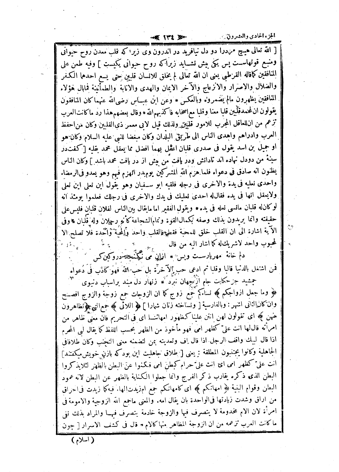 وهو يعدو فى الرمضاء واحدي نعليه فى يده والاخرى فى رجله فلقيه ابو سفيان وهو يقول اين نعلى اين نعلى ولا يعقل انها فى يده فقال له احدى نعليك فى يدك والاخرى فى رجلك فعلموا يومئذ انه لو كان له قلبان ما نسى نعله فى يده ويقول الفقير اما ما يقال بين الناس لفلان قلبان فليس على حقيقته وانما يريدون بذلك وصفه بكمال القوة وتمام الشجاعة كأنه رجلان وله قلبان وفى الآية اشارة الى ان القلب خلق للمحبة فقط فالقلب واحد والمحبة واحدة فلا تصلح الا لمحبوب واحد لا شريك له كما أشار اليه من قال
