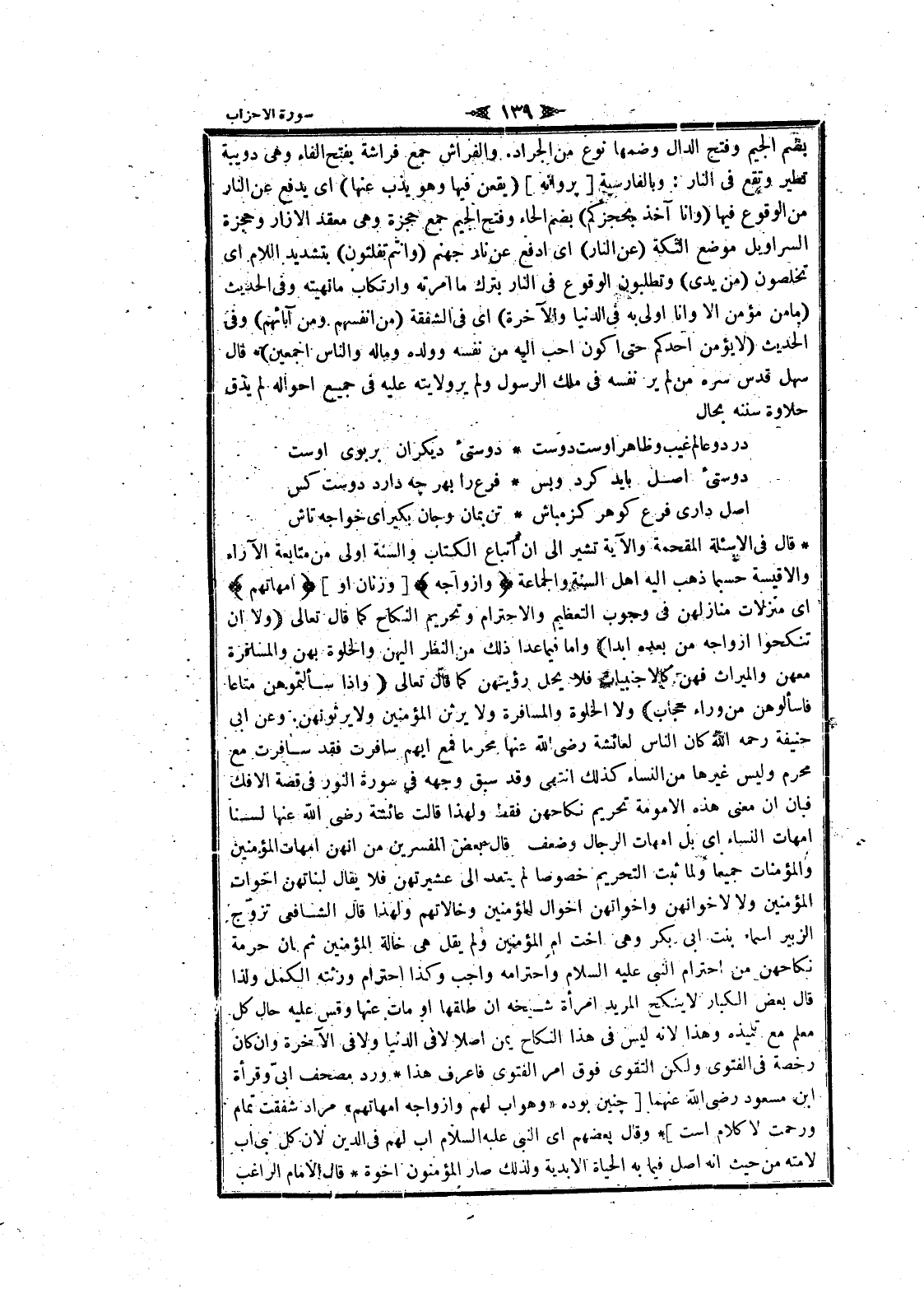 بضم الجيم وفتح الدال وضمها نوع من الجراد. والفراش جمع فراشة بفتح الفاء وهى دويبة تطير وتقع فى النار: وبالفارسية [پروانه] (يقعن فيها وهو يذب عنها) اى يدفع عن النار من الوقوع فيها (وانا آخذ بحجزكم) بضم الحاء وفتح الجيم جمع حجزة وهى معقد الإزار وحجزة السراويل موضع التكة (عن النار) اى ادفع عن نار جهنم (وأنتم تفلتون) بتشديد اللام اى تخلصون (من يدى) وتطلبون الوقوع فى النار بترك ما أمرته وارتكاب ما نهيته وفى الحديث (ما من مؤمن الا وانا اولى به فى الدنيا والآخرة) اى فى الشفقة (من أنفسهم ومن آبائهم) وفى الحديث (لا يؤمن أحدكم حتى أكون أحب اليه من نفسه وولده