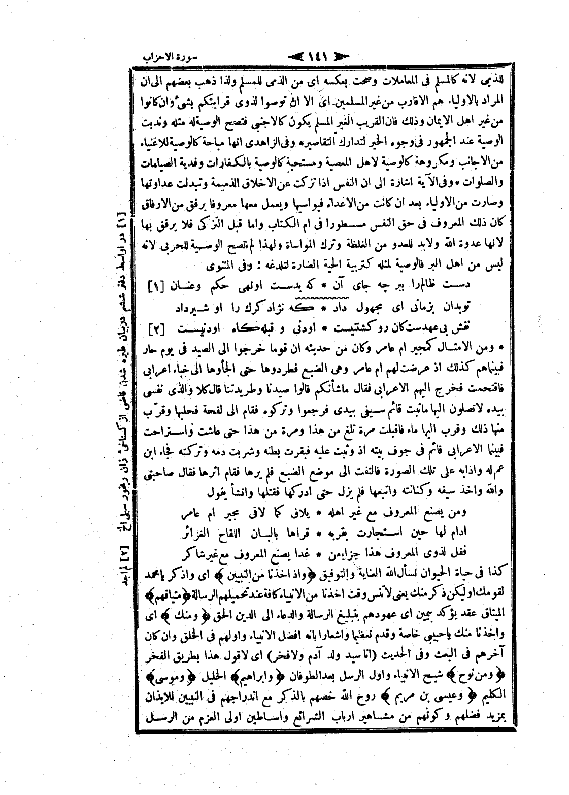 للذمى لانه كالمسلم فى المعاملات وصحت بعكسه اى من الذمي للمسلم ولذا ذهب بعضهم الى ان المراد بالأولياء هم الأقارب من غير المسلمين اى الا ان توصوا لذوى قرابتكم بشىء وان كانوا من غير اهل الايمان وذلك فان القريب الغير المسلم يكون كالاجنبى فتصح الوصية له مثله وندبت الوصية عند الجمهور فى وجوه الخير لتدارك التقاصير وفى الزاهدي انها مباحة كالوصية للاغنياء من الأجانب ومكروهة كالوصية لاهل المعصية ومستحبة كالوصية بالكفارات وفدية الصيامات والصلوات وفى الآية اشارة الى ان النفس إذا تزكت عن الأخلاق الذميمة وتبدلت عداوتها وصارت من الأولياء بعد ان كانت من الأعداء فيواسيها ويعمل معها معروفا برفق من الارفاق كان ذلك المعروف فى حق النفس مسطورا فى أم الكتاب واما قبل التزكى فلا يرفق بها لانها عدوة الله ولا بد للعدو من الغلظة وترك المواساة ولهذا لم تصح الوصية للحربى لانه ليس من اهل البر فالوصية لمثله كتربية الحية الضارة لتلدغه: وفى المثنوى