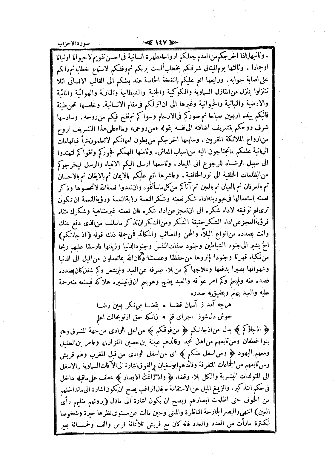 وثانيها إذا أخرجكم من العدم جعلكم أرواحا مطهرة انسانية فى احسن تقويم لا حيوانا او نباتا او جمادا. وثالثها يوم الميثاق شرفكم بخطاب ألست بربكم ثم وفقكم لاستماع خطابه ثم دلكم على إصابة جوابه. ورابعها أنعم عليكم بالنفخة الخاصة عند بعثكم الى القالب الإنساني لئلا تنزلوا بمنزل من المنازل السماوية والكوكبية والجنية والشيطانية والنارية والهوائية والمائية والارضية والنباتية والحيوانية وغيرها الى ان أنزلكم فى مقام الانسانية. وخامسها عجن طينة قالبكم بيده أربعين صباحا ثم صوركم فى الأرحام وسواكم ثم نفخ فيكم من روحه. وسادسها شرف روحكم بتشريف إضافته الى نفسه بقوله «من روحى» وما اعطى هذا التشريف لروح من أرواح الملائكة المقربين. وسابعها أخرجكم من بطون أمهاتكم لا تعلمون شيأ فبالهامات الربانية علمكم ما تحتاجون اليه من اسباب المعاش. وثامنها ألهمكم فجوركم وتقواكم لتهتدوا الى سبيل الرشاد للرجوع الى الميعاد. وتاسعها أرسل إليكم الأنبياء والرسل ليخرجوكم من الظلمات الخلقية الى نور الخالقية. وعاشرها أنعم عليكم بالايمان ثم بالإيقان ثم بالإحسان ثم بالعرفان ثم بالعيان ثم بالعين ثم آتاكم من كل ما سألتموه وان تعدوا نعمة الله لا تحصوها وذكر نعمته استعمالها فى عبوديته أداء شكر نعمته وشكر النعمة رؤية النعمة ورؤية النعمة ان تكون ترى نعم توفيقه لاداء شكره الى ان تعجز عن أداء شكره فان نعمته غير متناهية وشكرك متناه فرؤية العجز عن أداء الشكر حقيقة الشكر ومن الشكر ان تذكر ما سلف من الذي دفع عنك وأنت بصدده من انواع البلاء والمحن والمصائب والمكائد فمن جملة ذلك قوله (إِذْ جاءَتْكُمْ) إلخ يشير الى جنود الشياطين وجنود صفات النفس وجنود الدنيا وزينتها فارسلنا عليهم ريحا من نكباء قهرنا وجنودا لم تروها من حفظنا وعصمتنا وكان الله بما تعملون من الميل الى الدنيا وشهواتها بصيرا بدفعها وعلاجها كم من بلاء صرفه عن العبد ولم يشعر وكم شغل كان بصدده فصده عنه ولم يعلم وكم امر عوّقه والعبد يضج وهو يعلم ان فى تيسيره هلاكه فيمنعه منه رحمة عليه والعبد يهتم ويضيق به صدره
