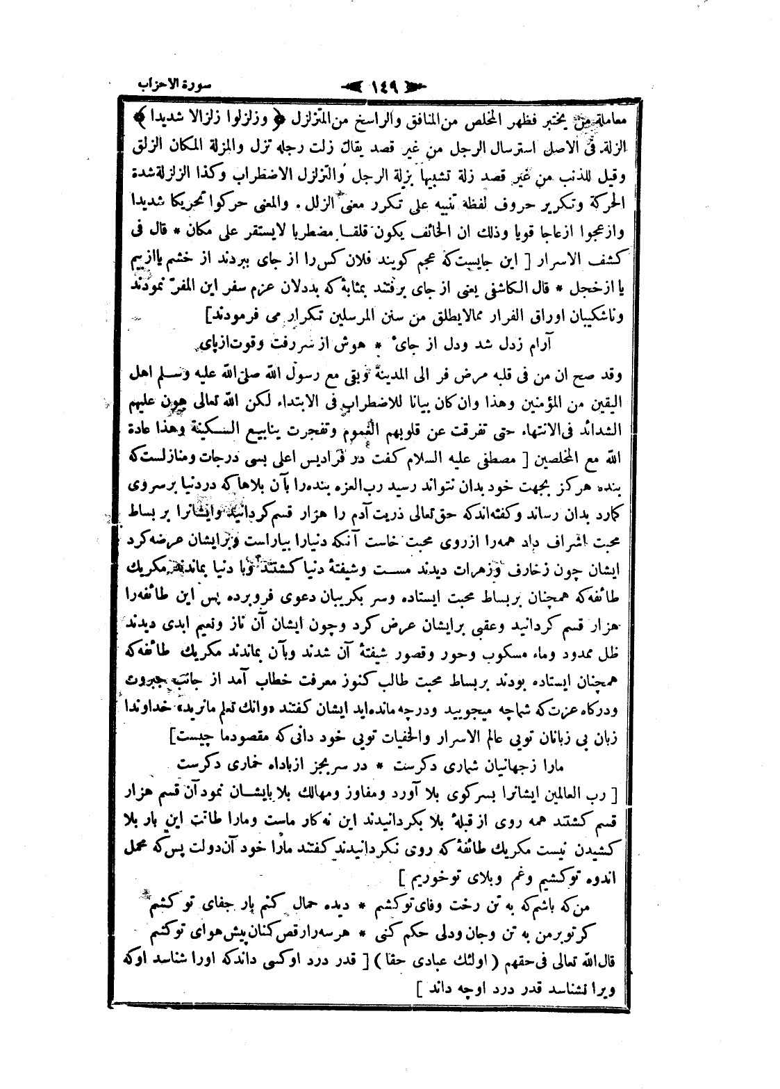 معاملة من يختبر فظهر المخلص من المنافق والراسخ من المتزلزل وَزُلْزِلُوا زِلْزالًا شَدِيداً الزلة فى الأصل استرسال الرجل من غير قصد يقال زلت رجله تزل والمزلة المكان الزلق وقيل للذنب من غير قصد زلة تشبيها بزلة الرجل والتزلزل الاضطراب وكذا الزلزلة شدة الحركة وتكرير حروف لفظه تنبيه على تكرر معنى الزلل. والمعنى حركوا تحريكا شديدا وازعجوا إزعاجا قويا وذلك ان الخائف يكون قلقا مضطربا لا يستقر على مكان قال فى كشف الاسرار [اين جايست كه عجم كويند فلان كس را از جاى ببردند از خشم يا از بيم يا از خجل قال الكاشفى يعنى از جاى برفتند بمثابه كه بددلان عزم سفر اين المفرّ نمودند وناشكيبان أوراق الفرار مما لا يطلق من سنن المرسلين تكرار مى فرمودند]