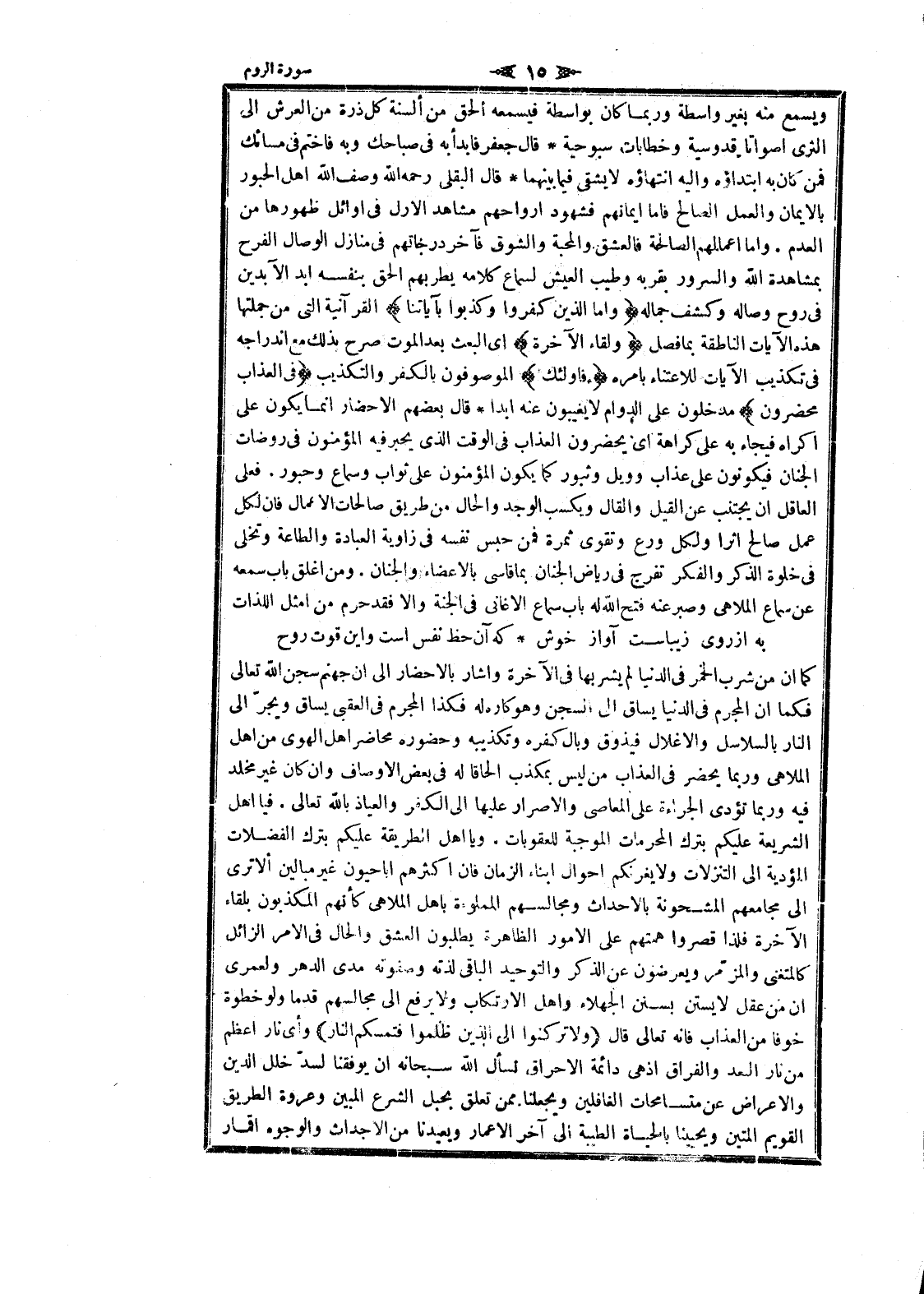 ويسمع منه بغير واسطة وربما كان بواسطة فيسمعه الحق من ألسنة كل ذرة من العرش الى الثرى أصواتا قدوسية وخطابات سبوحية قال جعفر فابدأ به فى صباحك وبه فاختم فى مسائك فمن كان به ابتداؤه واليه انتهاؤه لا يشقى فيما بينهما قال البقلى رحمه الله وصف الله اهل الحبور بالايمان والعمل الصالح فاما ايمانهم فشهود أرواحهم مشاهد الأزل فى أوائل ظهورها من العدم. واما أعمالهم الصالحة فالعشق والمحبة والشوق فآخر درجاتهم فى منازل الوصال الفرح بمشاهدة الله والسرور بقربه وطيب العيش لسماع كلامه يطربهم الحق بنفسه ابد الآبدين فى روح وصاله وكشف جماله وَأَمَّا الَّذِينَ كَفَرُوا وَكَذَّبُوا بِآياتِنا القرآنية التي من جملتها هذه الآيات الناطقة بما فصل وَلِقاءِ الْآخِرَةِ اى البعث بعد الموت صرح بذلك مع اندراجه فى تكذيب الآيات للاعتناء بامره فَأُولئِكَ الموصوفون بالكفر والتكذيب فِي الْعَذابِ مُحْضَرُونَ مدخلون على الدوام لا يغيبون عنه ابدا قال بعضهم الإحضار انما يكون على اكراه فيجاء به على كراهة اى يحضرون العذاب فى الوقت الذي يحبر فيه المؤمنون فى روضات الجنان فيكونون على عذاب وويل وثبور كما يكون المؤمنون على ثواب وسماع وحبور. فعلى العاقل ان يجتنب عن القيل والقال ويكسب الوجد والحال من طريق صالحات الأعمال فان لكل عمل صالح اثرا ولكل ورع وتقوى ثمرة فمن حبس نفسه فى زاوية العبادة والطاعة وتخلى فى خلوة الذكر والفكر تفرج فى رياض الجنان بما قاسى بالأعضاء والجنان. ومن اغلق باب سمعه عن سماع الملاهي وصبر عنه فتح الله له باب سماع الأغاني فى الجنة والا فقد حرم من أمثل اللذات