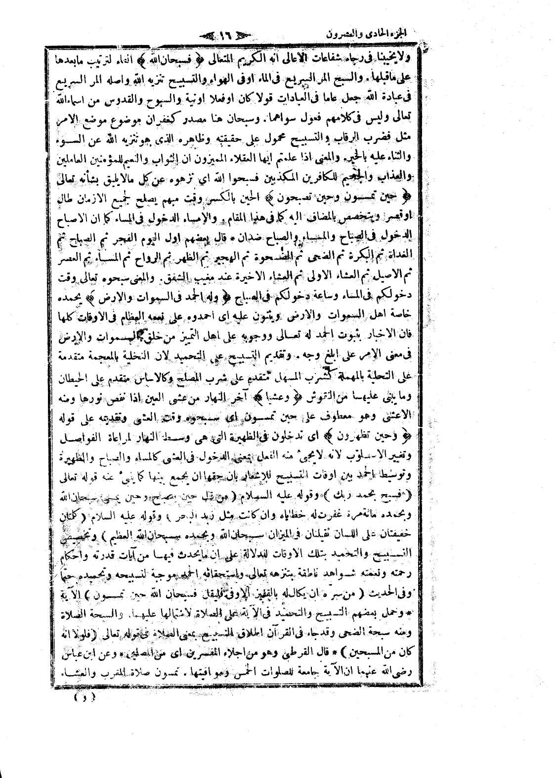ولا يخيبنا فى رجاء شفاعات الأعالي انه الكريم المتعالي فَسُبْحانَ اللَّهِ الفاء لترتيب ما بعدها على ما قبلها. والسبح المر السريع فى الماء او فى الهواء والتسبيح تنزيه الله وأصله المر السريع فى عبادة الله جعل عاما فى العبادات قولا كان او فعلا او نية والسبوح والقدوس من اسماء الله تعالى وليس فى كلامهم فعول سواهما. وسبحان هنا مصدر كغفران موضوع موضع الأمر مثل فضرب الرقاب والتسبيح محمول على حقيقته وظاهره الذي هو تنزيه الله عن السوء والثناء عليه بالخير. والمعنى إذا علمتم ايها العقلاء المميزون ان الثواب والنعيم للمؤمنين العاملين والعذاب والجحيم للكافرين المكذبين فسبحوا الله اى نزهوه عن كل ما لا يليق بشأنه تعالى حِينَ تُمْسُونَ وَحِينَ تُصْبِحُونَ الحين بالكسر وقت مبهم يصلح لجميع الأزمان طال او قصر ويتخصص بالمضاف اليه كما فى هذا المقام. والإمساء الدخول فى المساء كما ان الإصباح الدخول فى الصباح والمساء والصباح ضدان قال بعضهم أول اليوم الفجر ثم الصباح ثم الغداة ثم البكرة ثم الضحى ثم الضحوة ثم الهجير ثم الظهر ثم الرواح ثم المساء ثم العصر ثم الأصيل ثم العشاء الاولى ثم العشاء الاخيرة عند مغيب الشفق. والمعنى سبحوه تعالى وقت دخولكم فى المساء وساعة دخولكم فى الصباح وَلَهُ الْحَمْدُ فِي السَّماواتِ وَالْأَرْضِ يحمده خاصة اهل السموات والأرض ويثنون عليه اى احمدوه على نعمه العظام فى الأوقات كلها فان الاخبار بثبوت الحمد له تعالى ووجوبه على اهل التمييز من خلق السموات والأرض فى معنى الأمر على ابلغ وجه. وتقديم التسبيح على التحميد لان التخلية بالمعجمة متقدمة على التحلية بالمهملة كشرب المسهل متقدم على شرب المصلح وكالاساس متقدم على الحيطان وما يبنى عليها من النقوش وَعَشِيًّا آخر النهار من عشى العين إذا نفص نورها ومنه الأعشى وهو معطوف على حين تمسون اى سبحوه وقت العشى وتقديمه على قوله وَحِينَ تُظْهِرُونَ اى تدخلون فى الظهيرة التي هى وسط النهار لمراعاة الفواصل وتغيير الأسلوب لانه لا يجىء منه الفعل بمعنى الدخول فى العشى كالمساء والصباح والظهيرة وتوسيط احمد بين اوقات التسبيح للاشعار بان حقها ان يجمع بينها كما ينبىء عنه قوله تعالى (فَسَبِّحْ بِحَمْدِ رَبِّكَ) وقوله عليه السلام (من قال حين يصبح وحين يمسى سبحان الله وبحمده مائة مرة غفرت له خطاياه وان كانت مثل زبد البحر) وقوله عليه السلام (كلمتان خفيفتان على اللسان ثقيلتان فى الميزان سبحان الله وبحمده سبحان الله العظيم) وتخصيص التسبيح والتحميد بتلك الأوقات للدلالة على ان ما يحدث فيها من آيات قدرته واحكام رحمته ونعمته شواهد ناطقة بتنزهه تعالى واستحقاقه الحمد موجبة لتسبيحه وتحميده حتما وفى الحديث (من سرّه ان يكال له بالقفيز الاوفى فليقل فسبحان الله حين تمسون) الآية وحمل بعضهم التسبيح والتحميد فى الآية على الصلاة لاشتمالها عليهما. والسبحة الصلاة ومنه سبحة الضحى وقد جاء فى القرآن اطلاق التسبيح بمعنى الصلاة فى قوله تعالى (فَلَوْلا أَنَّهُ كانَ مِنَ الْمُسَبِّحِينَ) قال القرطبي وهو من اجلاء المفسرين اى من المصلين وعن ابن عباس رضى الله عنهما ان الآية جامعة للصلوات الخمس ومواقيتها. تمسون صلاة المغرب والعشاء