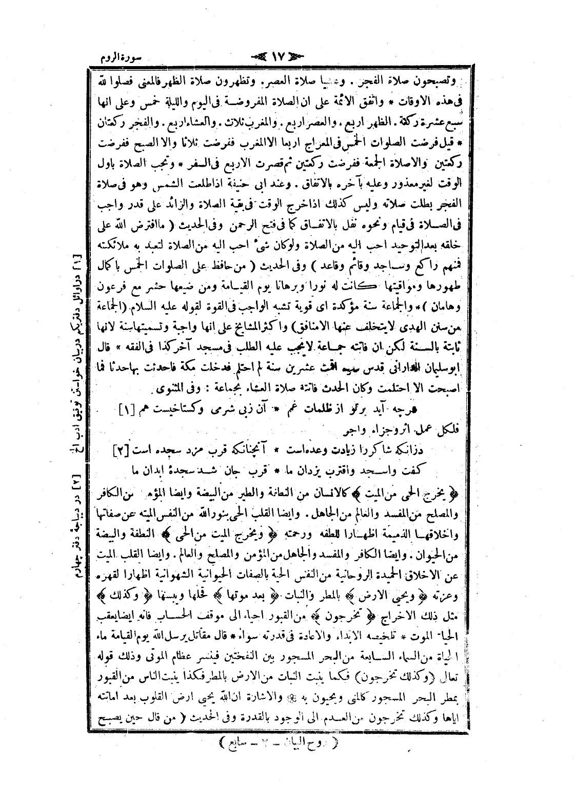 وتصبحون صلاة الفجر. وعشيا صلاة العصر. وتظهرون صلاة الظهر فالمعنى فصلوا لله فى هذه الأوقات واتفق الائمة على ان الصلاة المفروضة فى اليوم والليلة خمس وعلى انها سبع عشرة ركعة. الظهر اربع. والعصر اربع. والمغرب ثلاث. والعشاء اربع. والفجر ركعتان قيل فرضت الصلوات الخمس فى المعراج أربعا الا المغرب ففرضت ثلاثا والا الصبح ففرضت ركعتين والا صلاة الجمعة ففرضت ركعتين ثم قصرت الأربع فى السفر وتجب الصلاة باول الوقت لغير معذور وعليه بآخره بالاتفاق. وعند ابى حنيفة إذا طلعت الشمس وهو فى صلاة الفجر بطلت صلاته وليس كذلك إذا خرج الوقت فى بقية الصلاة والزائد على قدر واجب فى الصلاة فى قيام ونحوه نفل بالاتفاق كما فى فتح الرحمن وفى الحديث (ما افترض الله على خلقه بعد التوحيد أحب اليه من الصلاة ولو كان شىء أحب اليه من الصلاة لتعبد به ملائكته فمنهم راكع وساجد وقائم وقاعد) وفى الحديث (من حافظ على الصلوات الخمس بإكمال طهورها ومواقيتها كانت له نورا وبرهانا يوم القيامة ومن ضيعها حشر مع فرعون وهامان) والجماعة سنة مؤكدة اى قوية تشبه الواجب فى القوة لقوله عليه السلام (الجماعة من سنن الهدى لا يتخلف عنها الا منافق) واكثر المشايخ على انها واجبة وتسميتها سنة لانها ثابتة بالسنة لكن ان فاتته جماعة لا يجب عليه الطلب فى مسجد آخر كذا فى الفقه قال ابو سليمان الداراني قدس سره أقمت عشرين سنة لم احتلم فدخلت مكة فاحدثت بها حدثا فما أصبحت الا احتلمت وكان الحدث فاتته صلاة العشاء بجماعة: وفى المثنوى