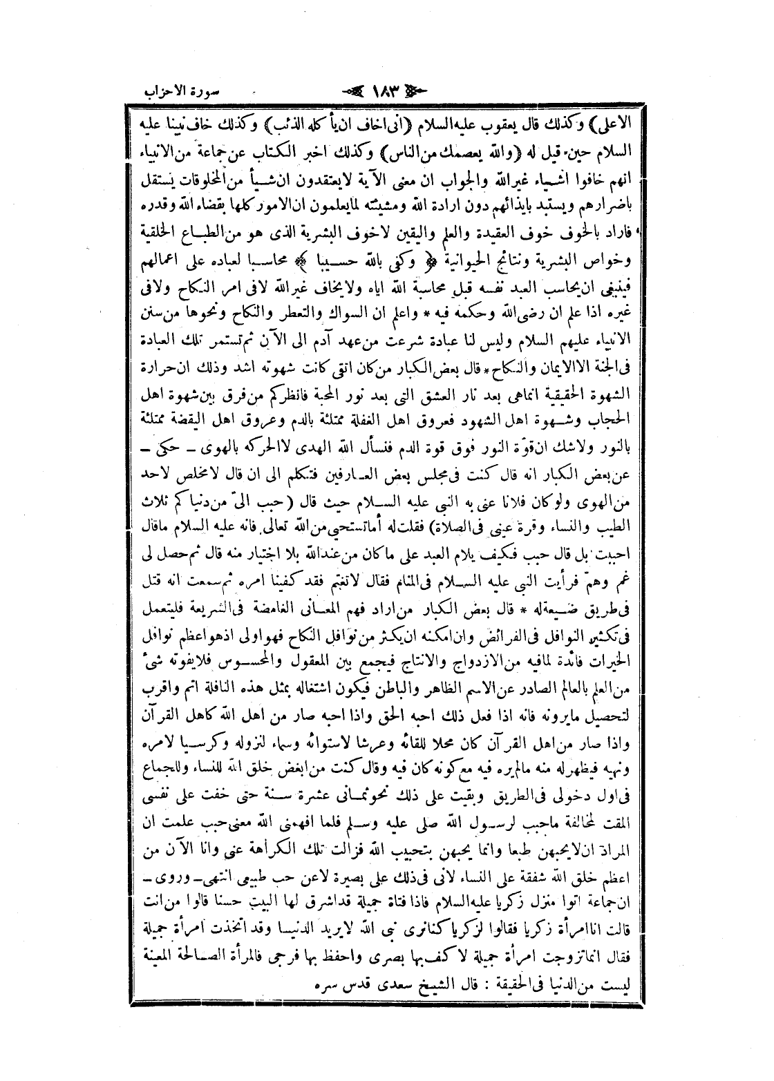 الى الآن ثم تستمر تلك العبادة فى الجنة الا الايمان والنكاح قال بعض الكبار من كان اتقى كانت شهوته أشد وذلك ان حرارة الشهوة الحقيقية انما هى بعد نار العشق التي بعد نور المحبة فانظركم من فرق بين شهوة اهل الحجاب وشهوة اهل الشهود فعروق اهل الغفلة ممتلئة بالدم وعروق اهل اليقظة ممتلئة بالنور ولا شك ان قوّة النور فوق قوة الدم فنسأل الله الهدى لا الحركة بالهوى- حكى- عن بعض الكبار انه قال كنت فى مجلس بعض العارفين فتكلم الى ان قال لا مخلص لاحد من الهوى ولو كان فلانا عنى به النبي عليه السلام حيث قال (حبب الىّ من دنياكم ثلاث الطيب والنساء وقرة عينى فى الصلاة) فقلت له أما تستحيى من الله تعالى فانه عليه السلام ما قال أحببت بل قال حبب فكيف يلام العبد على ما كان من عند الله بلا اختيار منه قال ثم حصل لى غم وهمّ فرأيت النبي عليه السلام فى المنام فقال لا تغتم فقد كفينا امره ثم سمعت انه قتل فى طريق ضيعة له قال بعض الكبار من أراد فهم المعاني الغامضة فى الشريعة فليتعمل فى تكثير النوافل فى الفرائض وان امكنه ان يكثر من نوافل النكاح فهو اولى إذ هو أعظم نوافل الخيرات فائدة لما فيه من الازدواج والانتاج فيجمع بين المعقول والمحسوس فلا يفوته شىء من العلم بالعالم الصادر عن الاسم الظاهر والباطن فيكون اشتغاله بمثل هذه النافلة أتم واقرب لتحصيل ما يرونه فانه إذا فعل ذلك أحبه الحق وإذا أحبه صار من اهل الله كاهل القرآن وإذا صار من اهل القرآن كان محلا للقائه وعرشا لاستوائه وسماء لنزوله وكرسيا لامره ونهيه فيظهر له منه ما لم يره فيه مع كونه كان فيه وقال كنت من ابغض خلق الله للنساء وللجماع فى أول دخولى فى الطريق وبقيت على ذلك نحو ثمانى عشرة سنة حتى خفت على نفسى المقت لمخالفة ما حبب لرسول الله صلى عليه وسلم فلما افهمنى الله معنى حبب علمت ان المراد ان لا يحبهن طبعا وانما يحبهن بتحبيب الله فزالت تلك الكراهة عنى وانا الآن من أعظم خلق الله شفقة على النساء لانى فى ذلك على بصيرة لاعن حب طبيعى انتهى- وروى- ان جماعة أتوا منزل زكريا عليه السلام فاذا فتاة جميلة قد أشرق لها البيت حسنا قالوا من أنت قالت انا امرأة زكريا فقالوا لزكريا كنا نرى نبى الله لا يريد الدنيا وقد اتخذت امرأة جميلة فقال انما تزوجت امرأة جميلة لا كف بها بصرى واحفظ بها فرجى فالمرأة الصالحة المعينة ليست من الدنيا فى الحقيقة: قال الشيخ سعدى قدس سره
