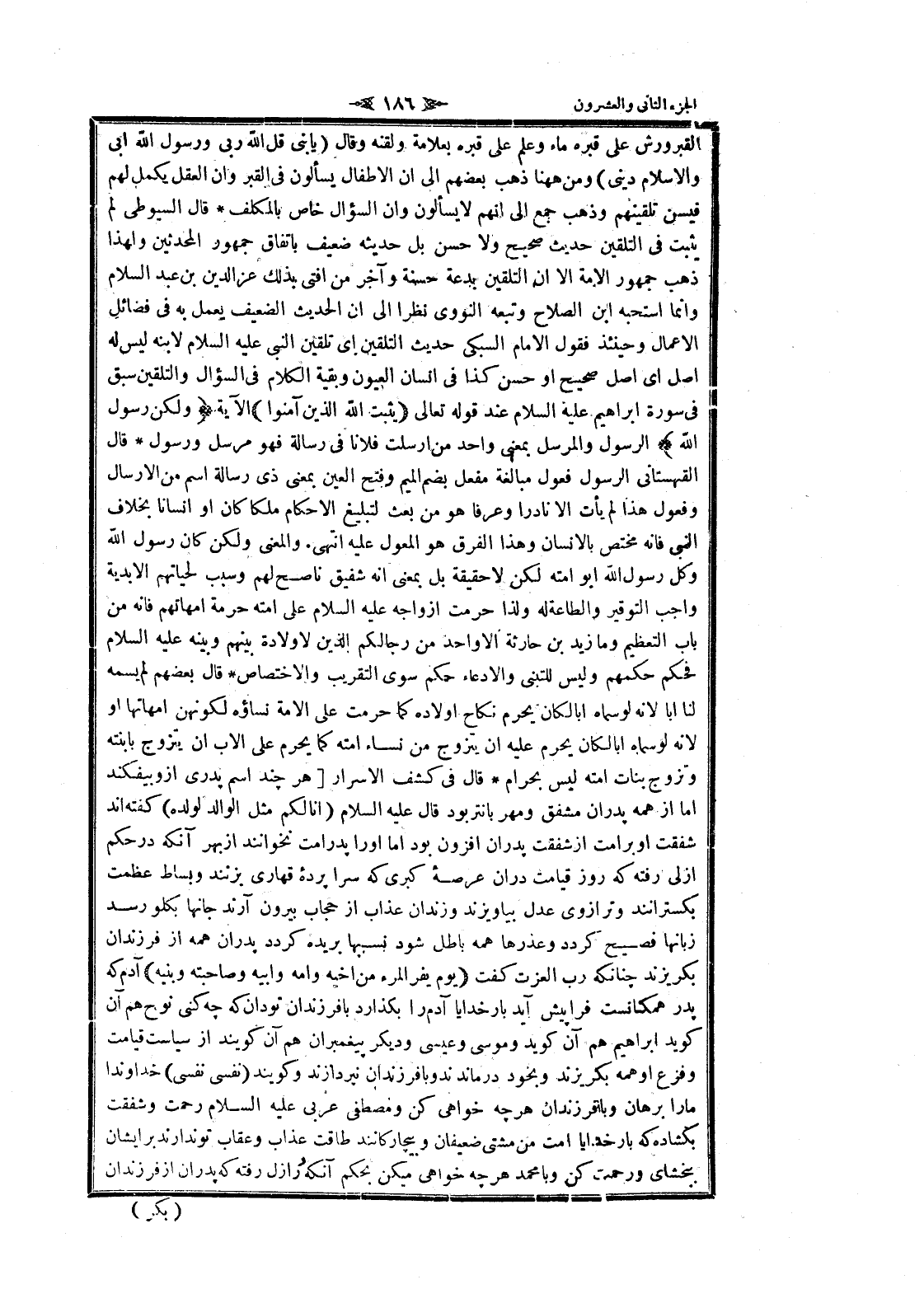 القبر ورش على قبره ماء وعلم على قبره بعلامة ولقنه وقال (يا بنى قل الله ربى ورسول الله ابى والإسلام دينى) ومن هاهنا ذهب بعضهم الى ان الأطفال يسألون فى القبر وان العقل يكمل لهم فيسن تلقينهم وذهب جمع الى انهم لا يسألون وان السؤال خاص بالمكلف قال السيوطي لم يثبت فى التلقين حديث صحيح ولا حسن بل حديثه ضعيف باتفاق جمهور المحدثين ولهذا ذهب جمهور الامة الا ان التلقين بدعة حسنة وآخر من افتى بذلك عز الدين بن عبد السلام وانما استحبه ابن الصلاح وتبعه النووي نظرا الى ان الحديث الضعيف يعمل به فى فضائل الأعمال وحينئذ فقول الامام السبكى حديث التلقين اى تلقين النبي عليه السلام لابنه ليس له اصل اى اصل صحيح او حسن كذا فى انسان العيون وبقية الكلام فى