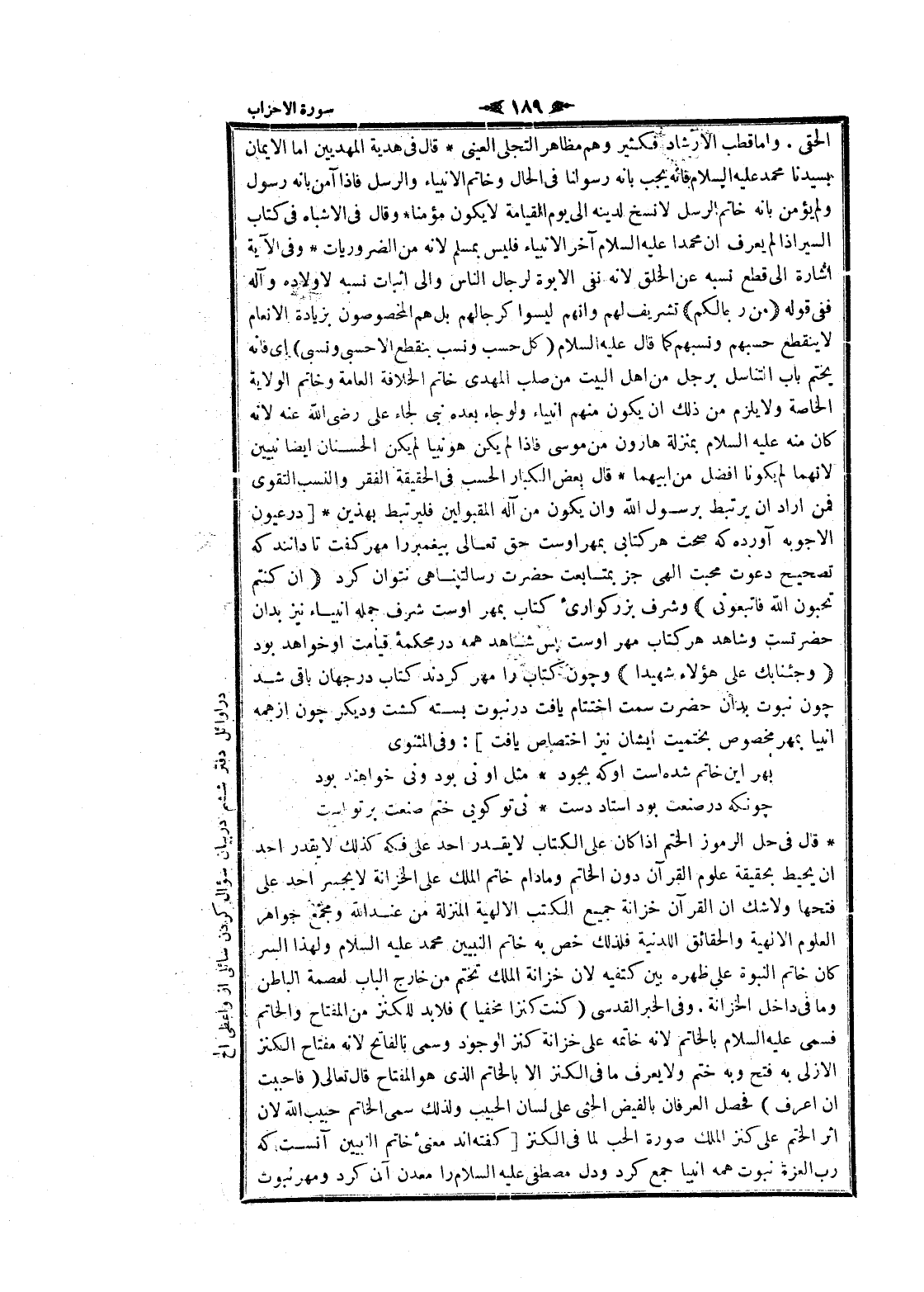 الحقي. واما قطب الإرشاد فكثير وهم مظاهر التجلي العيني قال فى هدية المهديين اما الايمان بسيدنا محمد عليه السلام فانه يجب بانه رسولنا فى الحال وخاتم الأنبياء والرسل فاذا آمن بانه رسول ولم يؤمن بانه خاتم الرسل لا نسخ لدينه الى يوم القيامة لا يكون مؤمنا وقال فى الأشباه فى كتاب السير إذا لم يعرف ان محمدا عليه السلام آخر الأنبياء فليس بمسلم لانه من الضروريات وفى الآية اشارة الى قطع نسبه عن الخلق لانه نفى الابوة لرجال الناس والى اثبات نسبه لاولاده وآله ففى قوله (مِنْ رِجالِكُمْ) تشريف لهم وانهم ليسوا كرجالهم بل هم المخصوصون بزيادة الانعام لا ينقطع حسبهم ونسبهم كما قال عليه السلام (كل حسب ونسب ينقطع إلا حسبي ونسبى) اى فانه يختم باب التناسل برجل من اهل البيت من صلب المهدى خاتم الخلافة العامة وخاتم الولاية الخاصة ولا يلزم من ذلك ان يكون منهم أنبياء ولو جاء بعده نبى لجاء على رضى الله عنه لانه كان منه عليه السلام بمنزلة هارون من موسى فاذا لم يكن هو نبيا لم يكن الحسنان ايضا نبيين لانهما لم يكونا أفضل من أبيهما قال بعض الكبار الحسب فى الحقيقة الفقر والنسب التقوى فمن أراد ان يرتبط برسول الله وان يكون من آله المقبولين فليرتبط بهذين [در عيون الاجوبة آورده كه صحت هر كتابى بمهر اوست حق تعالى پيغمبر را مهر كفت تا دانند كه تصحيح دعوت محبت الهى جز بمتابعت حضرت رسالتپناهى نتوان كرد (إِنْ كُنْتُمْ تُحِبُّونَ اللَّهَ فَاتَّبِعُونِي) وشرف بزركوارىء كتاب بمهر اوست شرف جمله أنبياء نيز بدان حضرتست وشاهد هر كتاب مهر اوست پس شاهد همه در محكمه قيامت او خواهد بود (وَجِئْنا بِكَ عَلى هؤُلاءِ شَهِيداً) و چون كتاب را مهر كردند كتاب در جهان باقى شد چون نبوت بدان حضرت سمت اختتام يافت در نبوت بسته كشت وديكر چون از همه انبيا بمهر مخصوص بختميت ايشان نيز اختصاص يافت] : وفى المثنوى