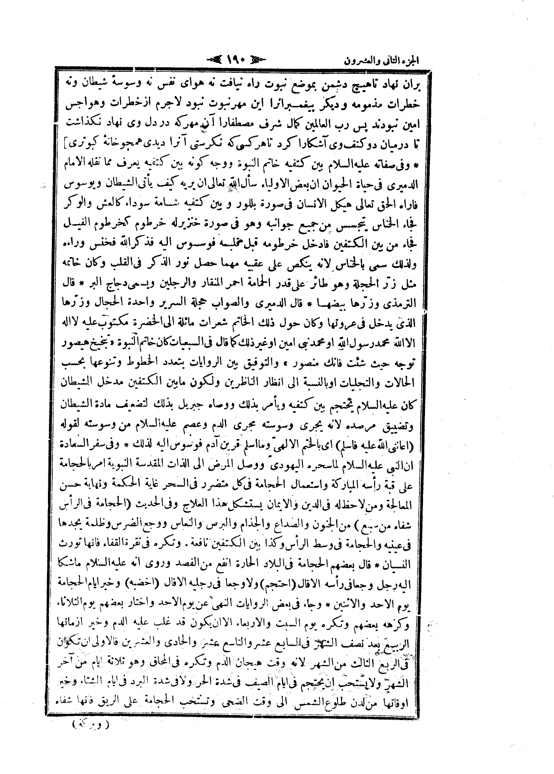بر ان نهاد تا هيچ دشمن بموضع نبوت راه نيافت نه هواى نفس نه وسوسه شيطان ونه خطرات مذمومه وديكر پيغمبران را اين مهر نبوت نبود لا جرم از خطرات وهواجس أمين نبودند پس رب العالمين كمال شرف مصطفا را آن مهر كه در دل وى نهاد نكذاشت تا در ميان دو كتف وى آشكارا كرد تا هر كسى كه نكرستى آنرا ديدى همچوخانه كبوترى] وفى صفاته عليه السلام بين كتفيه خاتم النبوة ووجه كونه بين كتفيه يعرف مما نقله الامام الدميري فى حياة الحيوان ان بعض الأولياء سأل الله تعالى ان يريه كيف يأتى الشيطان ويوسوس فاراه الحق تعالى هيكل الإنسان فى صورة بللور وبين كتفيه شامة سوداء كالعش والوكر فجاء الخناس يتجسس من جميع جوانبه وهو فى صورة خنزير له خرطوم كخرطوم الفيل فجاء من بين الكتفين فادخل خرطومه قبل قلبه فوسوس اليه فذكر الله فخنس وراءه ولذلك سمى بالخناس لانه ينكص على عقبيه مهما حصل نور الذكر فى القلب وكان خاتمه مثل زرّ الحجلة وهو طائر على قدر الحمامة احمر المنقار والرجلين ويسمى دجاج البر قال الترمذي وزرّها بيضها قال الدميري والصواب حجلة السرير واحدة الحجال وزرّها الذي يدخل فى عروتها وكان حول ذلك الخاتم شعرات مائلة الى الخضرة مكتوب عليه لا اله الا الله محمد رسول الله او محمد نبى أمين او غير ذلك كما قال فى السبعيات كان خاتم النبوة «تنجيخ هيصور توجه حيث شئت فانك منصور» والتوفيق بين الروايات بتعدد الخطوط وتنوعها بحسب الحالات والتجليات او بالنسبة الى انظار الناظرين ولكون ما بين الكتفين مدخل الشيطان كان عليه السلام يحتجم بين كتفيه ويأمر بذلك ووصاه جبريل بذلك لتضعيف مادة الشيطان وتضييق مرصده لانه يجرى وسوسته مجرى الدم وعصم عليه السلام من وسوسته لقوله (أعانني الله عليه فاسلم) اى بالختم الالهىّ وما اسلم قرين آدم فوسوس اليه لذلك وفى سفر السعادة ان النبي عليه السلام لما سحره اليهودىّ ووصل المرض الى الذات المقدسة النبوية امر بالحجامة على قبة رأسه المباركة واستعمال الحجامة فى كل متضرر فى السحر غاية الحكمة ونهاية حسن المعالجة ومن لا حظ له فى الدين والايمان يستشكل هذا العلاج وفى الحديث (الحجامة فى الرأس شفاء من سبع) من الجنون والصداع والجذام والبرص والنعاس ووجع الضرس وظلمة يجدها فى عينيه والحجامة فى وسط الرأس وكذا بين الكتفين نافعة. وتكره فى نقرة القفاء فانها تورث النسيان قال بعضهم الحجامة فى البلاد الحارة انفع من الفصد وروى انه عليه السلام ماشكا اليه رجل وجعا فى رأسه إلا قال (احتجم) ولا وجعا فى رجليه إلا قال (اخضبه) وخير ايام الحجامة يوم الأحد والاثنين وجاء فى بعض الروايات النهى عن يوم الأحد واختار بعضهم يوم الثلاثاء وكرهه بعضهم وتكره يوم السبت والأربعاء الا ان يكون قد غلب عليه الدم وخير أزمانها الربيع بعد نصف الشهر فى السابع عشر والتاسع عشر والحادي والعشرين فالاولى ان تكون فى الربع الثالث من الشهر لانه وقت هيجان الدم وتكره فى المحاق وهو ثلاثة ايام من آخر الشهر ولا يستحب ان يحتجم فى ايام الصيف فى شدة الحر ولا فى شدة البرد فى ايام الشتاء وخير أوقاتها من لدن طلوع الشمس الى وقت الضحى وتستحب الحجامة على الريق فانها شفاء