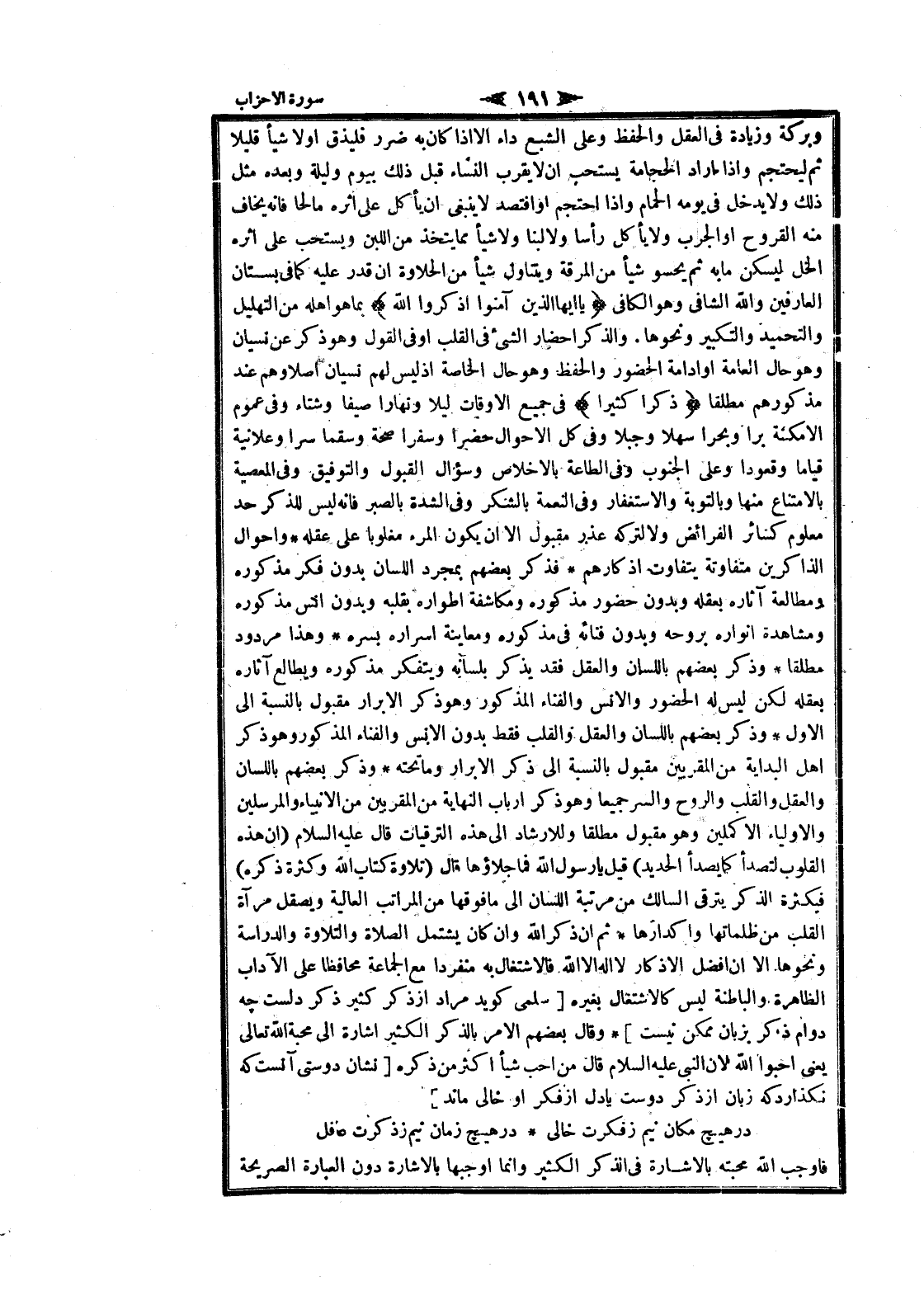 وبركة وزيادة فى العقل والحفظ وعلى الشبع داء الا إذا كان به ضرر فليذق اولا شيأ قليلا ثم ليحتجم وإذا أراد الحجامة يستحب ان لا يقرب النساء قبل ذلك بيوم وليلة وبعده مثل ذلك ولا يدخل فى يومه الحمام وإذا احتجم او افتصد لا ينبغى ان يأكل على اثره مالحا فانه يخاف منه القروح او الجرب ولا يأكل رأسا ولا لبنا ولا شيأ مما يتخذ من اللبن ويستحب على اثره الخل ليسكن ما به ثم يحسو شيأ من المرقة ويتناول شيأ من الحلاوة ان قدر عليه كما فى بستان العارفين والله الشافي وهو الكافي يا أَيُّهَا الَّذِينَ آمَنُوا اذْكُرُوا اللَّهَ بما هو اهله من التهليل والتحميد والتكبير ونحوها. والذكر إحضار الشيء فى القلب او فى القول وهو ذكر عن نسيان وهو حال العامة او ادامة الحضور والحفظ وهو حال الخاصة إذ ليس لهم نسيان أصلا وهم عند مذكورهم مطلقا ذِكْراً كَثِيراً فى جميع الأوقات ليلا ونهارا صيفا وشتاء وفى عموم الامكنة برا وبحرا سهلا وجبلا وفى كل الأحوال حضرا وسفرا صحة وسقما سرا وعلانية قياما وقعودا وعلى الجنوب وفى الطاعة بالإخلاص وسؤال القبول والتوفيق وفى المعصية بالامتناع منها وبالتوبة والاستغفار وفى النعمة بالشكر وفى الشدة بالصبر فانه ليس للذكر حد معلوم كسائر الفرائض ولا لتركه عذر مقبول الا ان يكون المرء مغلوبا على عقله واحوال الذاكرين متفاوتة يتفاوت اذكارهم فذكر بعضهم بمجرد اللسان بدون فكر مذكوره ومطالعة آثاره بعقله وبدون حضور مذكوره ومكاشفة أطواره بقلبه وبدون انس مذكوره ومشاهدة أنواره بروحه وبدون فنائه فى مذكوره ومعاينة أسراره بسره وهذا مردود مطلقا وذكر بعضهم باللسان والعقل فقد يذكر بلسانه ويتفكر مذكوره ويطالع آثاره بعقله لكن ليس له الحضور والانس والفناء المذكور وهو ذكر الأبرار مقبول بالنسبة الى الاول وذكر بعضهم باللسان والعقل والقلب فقط بدون الانس والفناء المذكور وهو ذكر اهل البداية من المقربين مقبول بالنسبة الى ذكر الأبرار وما تحته وذكر بعضهم باللسان والعقل والقلب والروح والسر جميعا وهو ذكر ارباب النهاية من المقربين من الأنبياء والمرسلين والأولياء الأكملين وهو مقبول مطلقا وللارشاد الى هذه الترقيات قال عليه السلام (ان هذه القلوب لتصدأ كما يصدأ الحديد) قيل يا رسول الله فما جلاؤها قال (تلاوة كتاب الله وكثرة ذكره) فبكثرة الذكر يترقى السالك من مرتبة اللسان الى ما فوقها من المراتب العالية ويصقل مرآة القلب من ظلماتها واكدارها ثم ان ذكر الله وان كان يشتمل الصلاة والتلاوة والدراسة ونحوها الا ان أفضل الاذكار لا اله الا الله فالاشتغال به منفردا مع الجماعة محافظا على الآداب الظاهرة والباطنة ليس كالاشتغال بغيره [سلمى كويد مراد از ذكر كثير ذكر دلست چهـ دوام ذكر بزبان ممكن نيست] وقال بعضهم الأمر بالذكر الكثير اشارة الى محبة الله تعالى يعنى أحبوا الله لان النبي عليه السلام قال من أحب شيأ اكثر من ذكره [نشان دوستى آنست كه نكذارد كه زبان از ذكر دوست يا دل از فكر او خالى ماند]