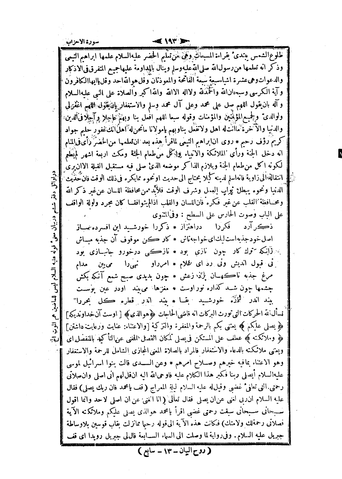 طلوع الشمس يبتدئ بقراءة المسبعات وهى من تعليم الخضر عليه السلام علمها ابراهيم التيمي وذكر انه تعلمها من رسول الله صلى الله عليه وسلم وينال بالمداومة عليها جميع المتفرق فى الاذكار والدعوات وهى عشرة أشياء سبعة سبعة الفاتحة والمعوذتان وقل هو الله أحد وقل يا ايها الكافرون وآية الكرسي وسبحان الله والحمد لله ولا اله الا الله والله اكبر والصلاة على النبي عليه السلام وآله بان يقول اللهم صل على محمد وعلى آل محمد وسلم والاستغفار بان يقول اللهم اغفر لى ولوالدىّ ولجميع المؤمنين والمؤمنات وقوله سبعا اللهم افعل بنا وبهم عاجلا وآجلا فى الدين والدنيا والآخرة ما أنت له اهل ولا تفعل بنا وبهم يا مولانا ما نحن له اهل انك غفور حليم جواد كريم رؤف رحيم روى ان ابراهيم التيمي لما قرأ هذه بعد ان تعلمها من الخضر رأى فى المنام انه دخل الجنة ورأى الملائكة والأنبياء وأكل من طعام الجنة ومكث اربعة أشهر لم يطعم لكونه أكل من طعام الجنة ويلازم الذاكر موضعه الذي صلى فيه مستقبل القبلة الا ان يرى انتقاله الى زاوية فانه اسلم لدينه كيلا يحتاج الى حديث او نحوه مما يكره فى ذلك الوقت فان حديث الدنيا ونحوه يبطل ثواب العمل وشرف الوقت فلابد من محافظة اللسان عن غير ذكر الله ومحافظة القلب عن غير فكره فان اللسان والقلب إذا لم يتوافقا كان مجرد ولولة الواقف على الباب وصوت الحارس على السطح: وفى المثنوى