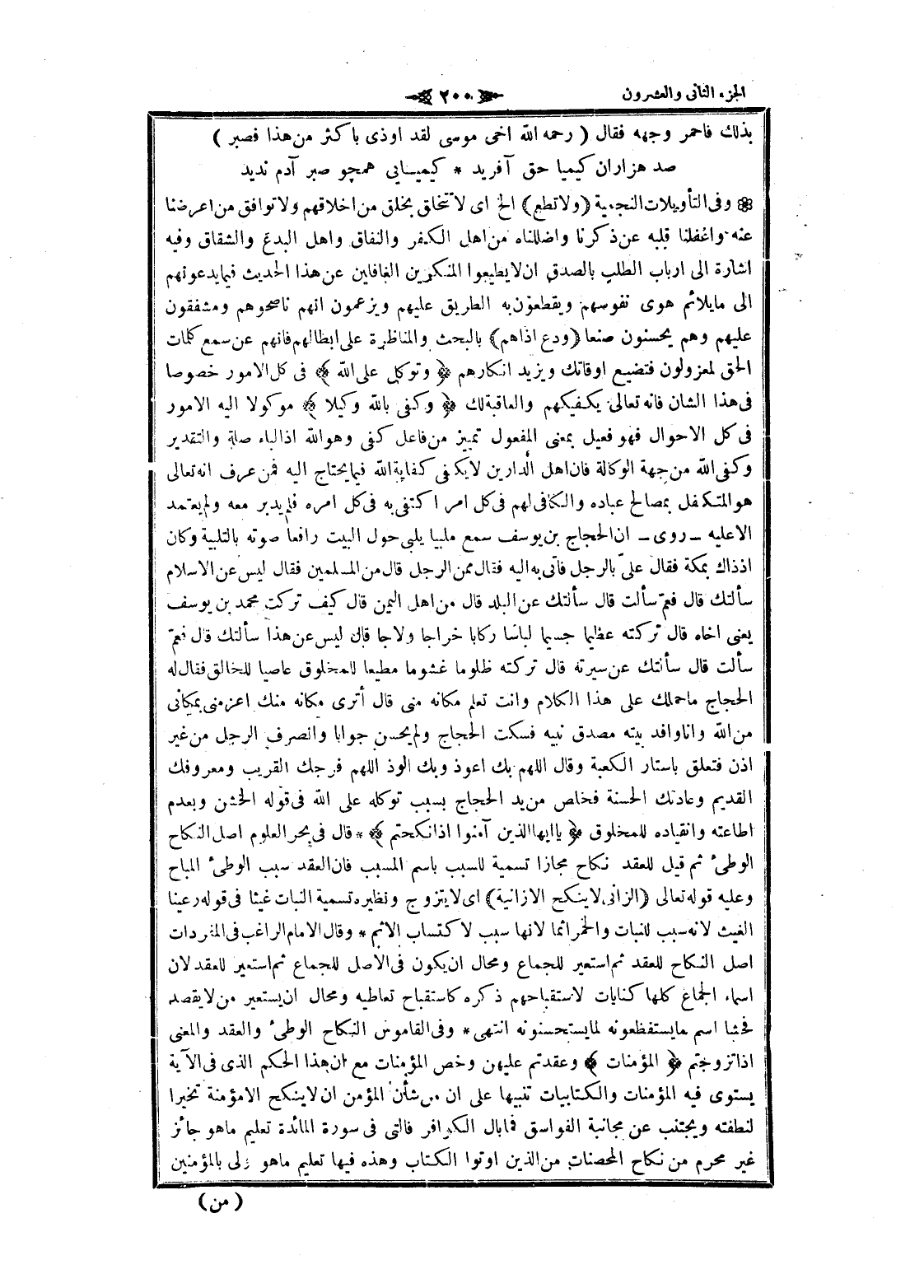 وفى التأويلات النجمية (وَلا تُطِعِ) إلخ اى لا تتخلق بخلق من اخلاقهم ولا توافق من أعرضنا عنه وأغفلنا قلبه عن ذكرنا واضللناه من اهل الكفر والنفاق واهل البدع والشقاق وفيه اشارة الى ارباب الطلب بالصدق ان لا يطيعوا المنكرين الغافلين عن هذا الحديث فيما يدعونهم الى ما يلائم هوى نفوسهم ويقطعون به الطريق عليهم ويزعمون انهم ناصحوهم ومشفقون عليهم وهم يحسنون صنعا (وَدَعْ أَذاهُمْ) بالبحث والمناظرة على ابطالهم فانهم عن سمع كلمات الحق لمعزولون فتضيع أوقاتك ويزيد انكارهم وَتَوَكَّلْ عَلَى اللَّهِ فى كل الأمور خصوصا فى هذا الشان فانه تعالى يكفيكهم والعاقبة لك وَكَفى بِاللَّهِ وَكِيلًا موكولا اليه الأمور فى كل الأحوال فهو فعيل بمعنى المفعول تمييز من فاعل كفى وهو الله إذ الباء صلة والتقدير وكفى الله من جهة الوكالة فان اهل الدارين لا يكفى كفاية الله فيما يحتاج اليه فمن عرف انه تعالى هو المتكفل بمصالح عباده والكافي لهم فى كل امر اكتفى به فى كل امره فلم يدبر معه ولم يعتمد الا عليه- روى- ان الحجاج بن يوسف سمع ملبيا يلبى حول البيت رافعا صوته بالتلبية وكان إذ ذاك بمكة فقال علىّ بالرجال فاتى به اليه فقال ممن الرجل قال من المسلمين فقال ليس عن الإسلام سألتك قال فعمّ سألت قال سألتك عن البلد قال من اهل اليمن قال كيف تركت محمد بن يوسف يعنى أخاه قال تركته عظيما جسيما لباسا ركابا خراجا ولاجا قال ليس عن هذا سألتك قال فعمّ سألت قال سألتك عن سيرته قال تركته ظلوما غشوما مطيعا للمخلوق عاصيا للخالق فقال له الحجاج ما حملك على هذا الكلام وأنت تعلم مكانه منى قال أترى مكانه منك أعز مني بمكاني من الله وانا وافد بيته مصدق نبيه فسكت الحجاج ولم يحسن جوابا وانصرف الرجل من غير اذن فتعلق بأستار الكعبة وقال اللهم بك أعوذ وبك الوذ اللهم فرجك القريب ومعروفك القديم وعادتك الحسنة فخلص من يد الحجاج بسبب توكله على الله فى قوله الخشن وبعدم اطاعته وانقياده للمخلوق يا أَيُّهَا الَّذِينَ آمَنُوا إِذا نَكَحْتُمُ قال فى بحر العلوم اصل النكاح الوطئ ثم قيل للعقد نكاح مجازا تسمية للسبب باسم المسبب فان العقد سبب الوطئ المباح وعليه قوله تعالى (الزَّانِي لا يَنْكِحُ إِلَّا زانِيَةً) اى لا يتزوج ونظيره تسمية النبات غيثا فى قوله رعينا الغيث لانه سبب للنبات والخمر اثما لانها سبب لاكتساب الإثم وقال الامام الراغب فى المفردات اصل النكاح للعقد ثم استعير للجماع ومحال ان يكون فى الأصل للجماع ثم استعير للعقد لان اسماء الجماع كلها كنايات لاستقباحهم ذكره كاستقباح تعاطيه ومحال ان يستعير من لا يقصد فحشا اسم ما يستفظعونه لما يستحسنونه انتهى وفى القاموس النكاح الوطئ والعقد والمعنى إذا تزوجتم الْمُؤْمِناتِ وعقدتم عليهن وخص المؤمنات مع ان هذا الحكم الذي فى الآية يستوى فيه المؤمنات والكتابيات تنبيها على ان من شأن المؤمن ان لا ينكح الا مؤمنة تخيرا لنطفته ويجتنب عن مجانبة الفواسق فما بال الكوافر فالتى فى سورة المائدة تعليم ما هو جائز غير محرم من نكاح المحصنات من الذين أوتوا الكتاب وهذه فيها تعليم ما هو اولى بالمؤمنين