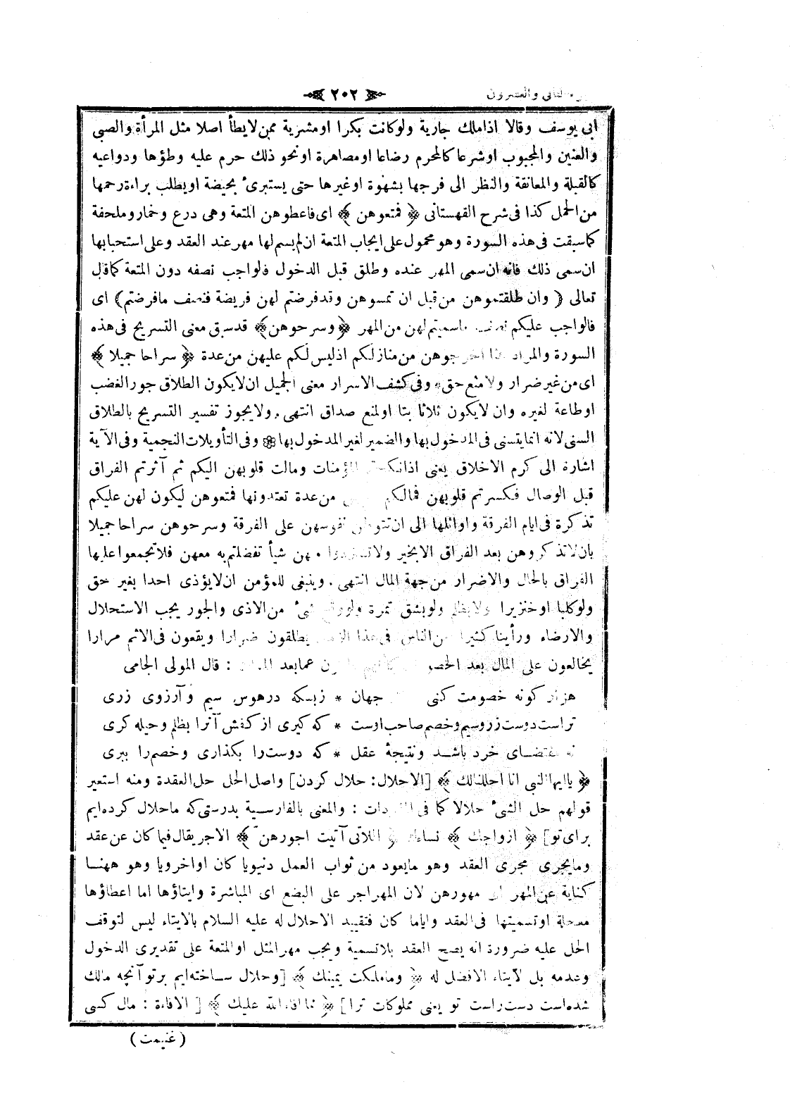 ابى يوسف وقالا إذا ملك جارية ولو كانت بكرا او مشرية ممن لا يطأ أصلا مثل المرأة والصبى والعنين والمجبوب او شرعا كالمحرم رضاعا او مصاهرة او نحو ذلك حرم عليه وطؤها ودواعيه كالقبلة والمعانقة والنظر الى فرجها بشهوة او غيرها حتى يستبرئ بحيضة او يطلب براءة رحمها من الحمل كذا فى شرح القهستاني فَمَتِّعُوهُنَّ اى فاعطوهن المتعة وهى درع وخمار وملحفة كما سبقت فى هذه السورة وهو محمول على إيجاب المتعة ان لم يسم لها مهر عند العقد وعلى استحبابها ان سمى ذلك فانه ان سمى المهر عنده وطلق قبل الدخول فالواجب نصفه دون المتعة كما قال تعالى (وَإِنْ طَلَّقْتُمُوهُنَّ مِنْ قَبْلِ أَنْ تَمَسُّوهُنَّ وَقَدْ فَرَضْتُمْ لَهُنَّ فَرِيضَةً فَنِصْفُ ما فَرَضْتُمْ) اى فالواجب عليكم نصف ما سميتم لهن من المهر وَسَرِّحُوهُنَّ قد سبق معنى التسريح فى هذه السورة والمراد هنا اخرجوهن من منازلكم إذ ليس لكم عليهن من عدة سَراحاً جَمِيلًا اى من غير ضرار ولا منع حق وفى كشف الاسرار معنى الجميل ان لا يكون الطلاق جور الغضب او طاعة لغيره وان لا يكون ثلاثا بتا او لمنع صداق انتهى. ولا يجوز تفسير التسريح بالطلاق السنى لانه انما يتسنى فى المدخول بها والضمير لغير المدخول بها وفى التأويلات النجمية وفى الآية اشارة الى كرم الأخلاق يعنى إذا نكحتم المؤمنات ومالت قلوبهن إليكم ثم آثرتم الفراق قبل الوصال فكسرتم قلوبهن فما لكم عليهن من عدة تعتدونها فمتعوهن ليكون لهن عليكم تذكرة فى ايام الفرقة واوائلها الى ان تتوطن نفوسهن على الفرقة وسرحوهن سراحا جميلا بان لا تذكروهن بعد الفراق الا بخير ولا تستردوا منهن شيأ تفضلتم به معهن فلا تجمعوا عليها الفراق بالحال والإضرار من جهة المال انتهى. وينبغى للمؤمن ان لا يؤذى أحدا بغير حق ولو كلبا او خنزيرا ولا يظلم ولو بشق تمرة ولو وقع شىء من الأذى والجور يجب الاستحلال والإرضاء ورأينا كثيرا من الناس فى هذا الزمان يطلقون ضرارا ويقعون فى الإثم مرارا يخالعون على المال بعد الخصومات كأنهم غافلون عما بعد الممات: قال المولى الجامى