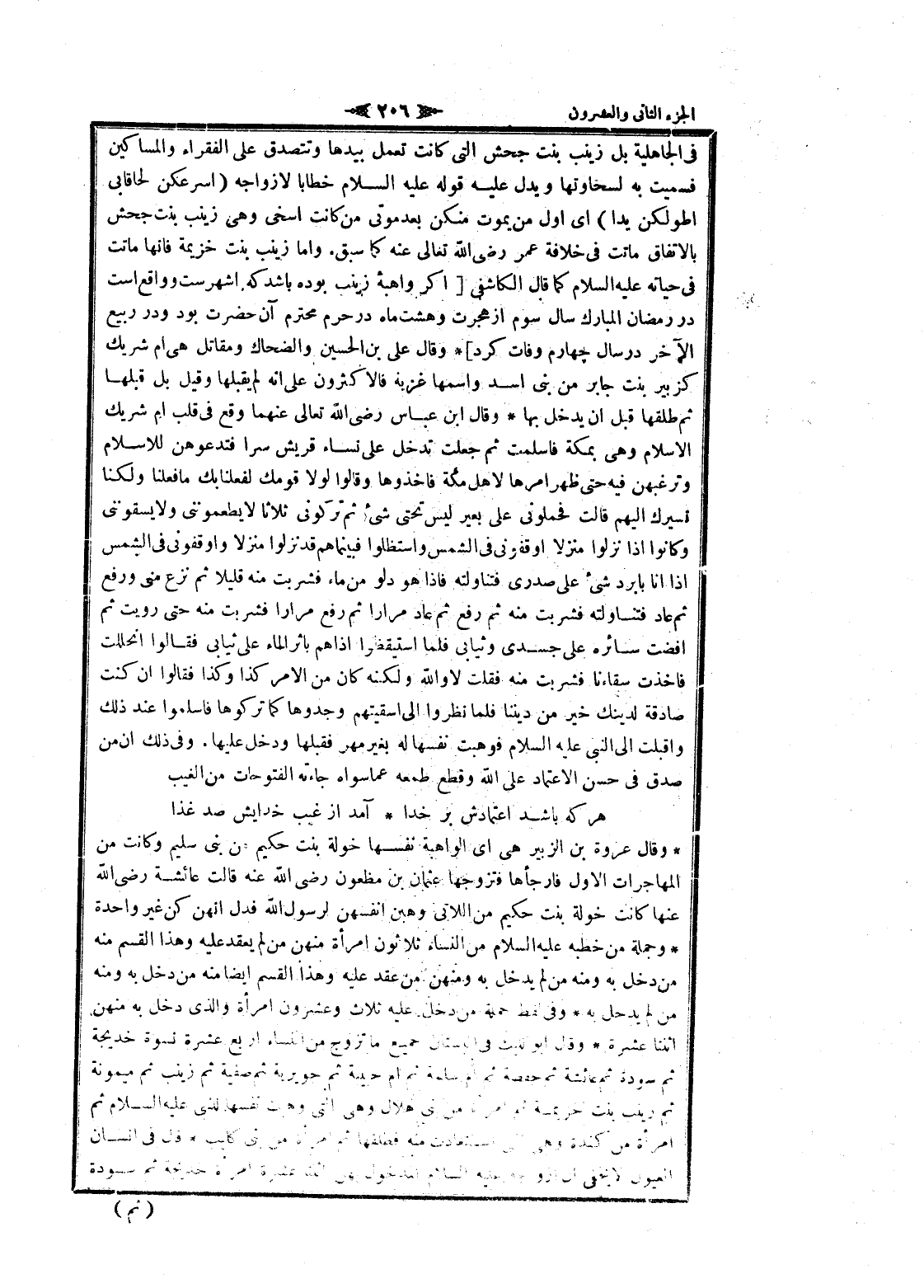 فى الجاهلية بل زينب بنت جحش التي كانت تعمل بيدها وتتصدق على الفقراء والمساكين فسميت به لسخاوتها ويدل عليه قوله عليه السلام خطابا لازواجه (أسرعكن لحاقابى أطولكن يدا) اى أول من يموت منكن بعد موتى من كانت أسخى وهى زينب بنت جحش بالاتفاق ماتت فى خلافة عمر رضى الله تعالى عنه كما سبق. واما زينب بنت خزيمة فانها ماتت فى حياته عليه السلام كما قال الكاشفى [اگر واهبه زينب بوده باشد كه اشهرست وواقع است در رمضان المبارك سال سوم از هجرت وهشت ماه در حرم محترم آن حضرت بود ودر ربيع الآخر در سال چهارم وفات كرد] وقال على بن الحسين والضحاك ومقاتل هى أم شريك كزبير بنت جابر من بنى اسد واسمها غزبة فالاكثرون على انه لم يقبلها وقيل بل قبلها ثم طلقها قبل ان يدخل بها وقال ابن عباس رضى الله تعالى عنهما وقع فى قلب أم شريك الإسلام وهى بمكة فاسلمت ثم جعلت تدخل على نساء قريش سرا فتدعوهن للاسلام وترغبهن فيه حتى ظهر أمرها لاهل مكة فاخذوها وقالوا لولا قومك لفعلنا بك ما فعلنا ولكنا نسيرك إليهم قالت فحملونى على بعير ليس تحتى شىء ثم تركونى ثلاثا لا يطعموننى ولا يسقوننى وكانوا إذا نزلوا منزلا أوقفوني فى الشمس واستظلوا فبينماهم قد نزلوا منزلا وأوقفوني فى الشمس إذا انا بأبرد شىء على صدرى فتناولته فاذا هو دلو من ماء فشربت منه قليلا ثم نزع منى ورفع ثم عاد فتناولته فشربت منه ثم رفع ثم عاد مرارا ثم رفع مرارا فشربت منه حتى رويت ثم افضت سائره على جسدى وثيابى فلما استيقظوا اذاهم بأثر الماء على ثيابى فقالوا انحللت فاخذت سقاءنا فشربت منه فقلت لا والله ولكنه كان من الأمر كذا وكذا فقالوا ان كنت صادقة لدينك خير من ديننا فلما نظروا الى أسقيتهم وجدوها كما تركوها فاسلموا عند ذلك وأقبلت الى النبي عليه السلام فوهبت نفسها له بغير مهر فقبلها ودخل عليها. وفى ذلك ان من صدق فى حسن الاعتماد على الله وقطع طمعه عما سواه جاءته الفتوحات من الغيب