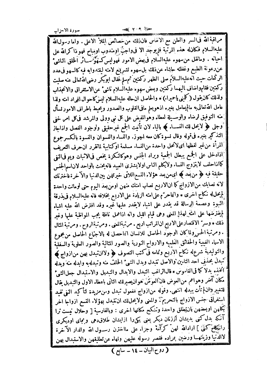 مراقبة الله فى السر والعلن مع الأنفاس فان ذلك من خصائص الملأ الأعلى. واما رسول الله عليه السلام فكان له هذه المرتبة فلم يوجد الا فى واجب او مندوب او مباح فهو ذاكر الله على احيانه. وما نقل من سهوه عليه السلام فى بعض الأمور فهو ليس كسهو سائر الخلق الناشئ عن رعونة الطبع وغفلته حاشاه عن ذلك بل سهوه تشريع لامته ليقتدوا به فيه كالسهو فى عدد الركعات حيث انه عليه السلام صلى الظهر ركعتين ثم سلم فقال ابو بكر رضى الله تعالى عنه صليت ركعتين فقام وأضاف إليهما ركعتين وبعض سهوه عليه السلام ناشىء عن الاستغراق والانجذاب ولذلك كان يقول (كلمينى يا حميراء) والحاصل ان حاله عليه السلام ليس كاحوال افراد أمته ولذا عامل الله تعالى به ما لم يعامل بغيره إذ هو يعلم ما فى القلوب والصدور ويحيط باطراف الأمور نسأل منه التوفيق لرضاه والوسيلة لعطاه وهو المفيض على كل نبى وولى والمرشد فى كل امر خفى وجلى لا يَحِلُّ لَكَ النِّساءُ بالياء لان تأنيث الجمع غير حقيقى ولوجود الفصل وإذا جاز التذكير بغيره فى قوله وقال نسوة كان معه اجوز. والنساء والنسوان والنسوة بالكسر جموع المرأة من غير لفظها اى لا تحل واحدة من النساء مسلمة او كتابية لما تقرر ان حرف التعريف إذا دخل على الجمع يبطل الجمعية ويراد الجنس وهو كالنكرة يخص فى الإثبات ويعم فى النفي كما إذا حلف لا يتزوج النساء ولا يكلم الناس او لا يشترى العبيد فانه يحنث بالواحد لان اسم الجنس حقيقة فيه مِنْ بَعْدُ اى من بعد هؤلاء التسع اللاتي خيرتهن بين الدنيا والآخرة فاخترنك لانه نصابك من الأزواج كما ان الأربع نصاب أمتك منهن او من بعد اليوم حتى لو ماتت واحدة لم يحل له نكاح اخرى وانما حرّم على أمته الزيادة على الأربع بخلافه فانه عليه السلام فى بذرقة النبوة وعصمة الرسالة قد يقدر على أشياء لا يقدر عليها غيره وقد افترض الله عليه أشياء لم يفترضها على أمته لهذا المعنى وهى قيام الليل وانه إذا عمل نافلة يجب المواظبة عليها وغير ذلك وسرّ الاقتصار على الأربع ان المراتب اربع. مرتبة المعنى. ومرتبة الروح. ومرتبة المثال. ومرتبة الحس ولما كان الوجود الحاصل للانسان انما حصل له بالاجتماع الحاصل من مجموع الأسماء الغيبية والحقائق العلمية والأرواح النورية والصور المثالية والصور العلوية والسفلية والتوليدية شرع له نكاح الأربع وتمامه فى كتب التصوف وَلا أَنْ تَبَدَّلَ بِهِنَّ مِنْ أَزْواجٍ تبدل بحذف أحد التاءين والأصل تتبدل وبدل الشيء الخلف منه وتبدله به وأبدله منه وبدله اتخذه بدلا كما فى القاموس قال الراغب التبدل والابدال والتبديل والاستبدال جعل الشيء مكان آخر وهو أعم من العوض فان العوض هو ان يصير لك الثاني بإعطاء الاول والتبديل يقال للتغيير وان لم تأت ببدله انتهى. وقوله من ازواج مفعول تبدل ومن مزيدة لتأكيد النفي تفيد استغراق جنس الأزواج بالتحريم. والمعنى ولا يحل لك ان تتبدل بهؤلاء التسع أزواجا اخر بكلهن او بعضهن بان تطلق واحدة وتنكح مكانها اخرى: وبالفارسية [وحلال نيست ترا آنكه بدل كنى بديشان از زنان ديكر يعنى يكى را از ايشان طلاق دهى وبجاى او ديكرى را نكاح كنى] أراد الله لهنّ كرامة وجزاء على ما اخترن رسول الله والدار الآخرة لا الدنيا وزينتها ورضين بمراده فقصر رسوله عليهن ونهاه عن تطليقهن والاستبدال بهن